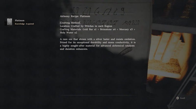 Platinum stands out because of its durability and resistance to oxidation, making it a valuable resource for crafting advanced catalysts and duration-enhancing items. If you’re focusing on high-tier alchemy builds, unlocking this recipe early gives you a strong advantage.