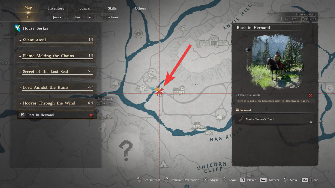 You will need to progress through the Serkis Estate faction questline until you reach “Hooves Through the Wind.” Once active, your next objective takes you to Bloomwood Ranch in Anvil Hill, located within the Hernand region.