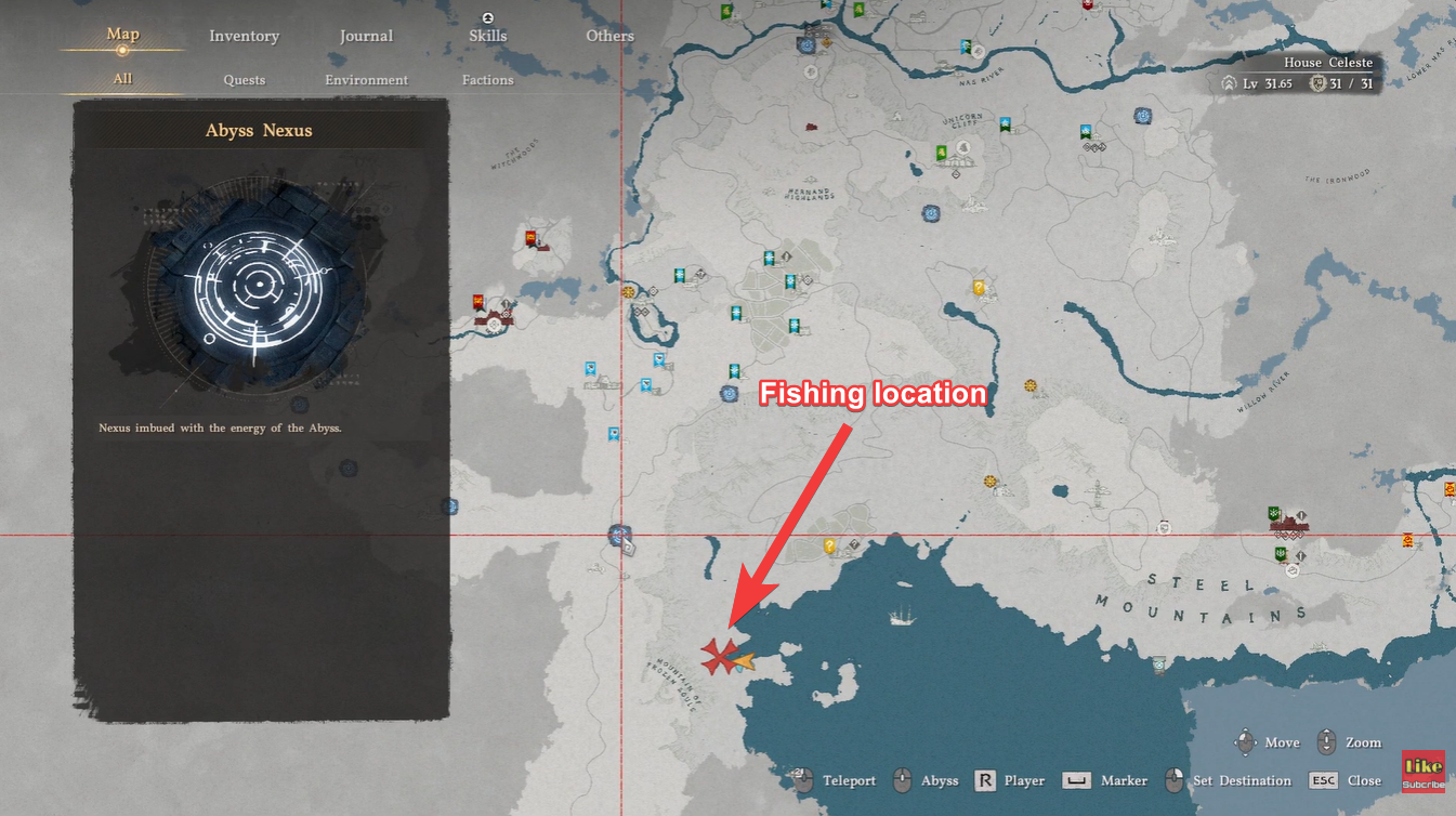 The fishing spot is located along the icy coastal edge of the Mountain of Frozen Souls, specifically southwest of the Steel Mountains. You’ll want to navigate toward a teleportation point nearby, then move toward the shoreline where the water meets frozen terrain.