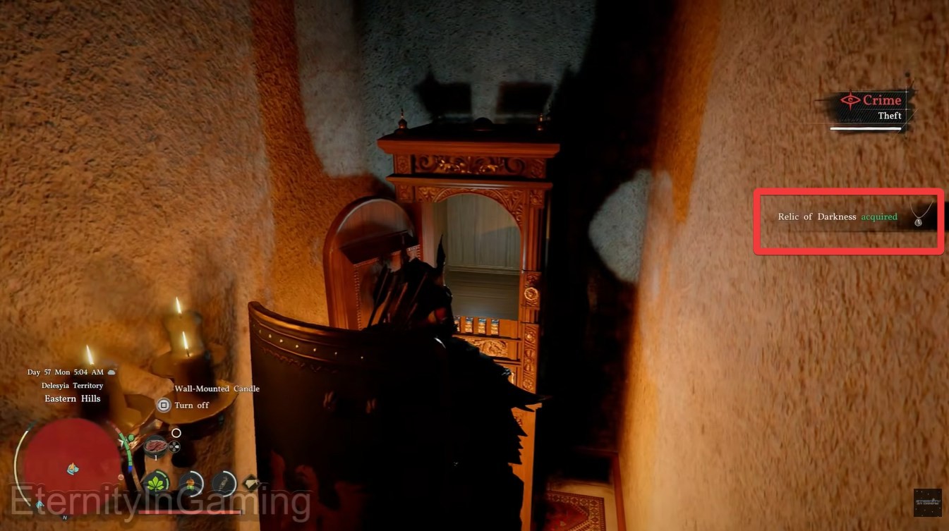 - The Relic of Darkness is obtained from a hidden strongbox puzzle in Eastern Hill, Delesyia.
