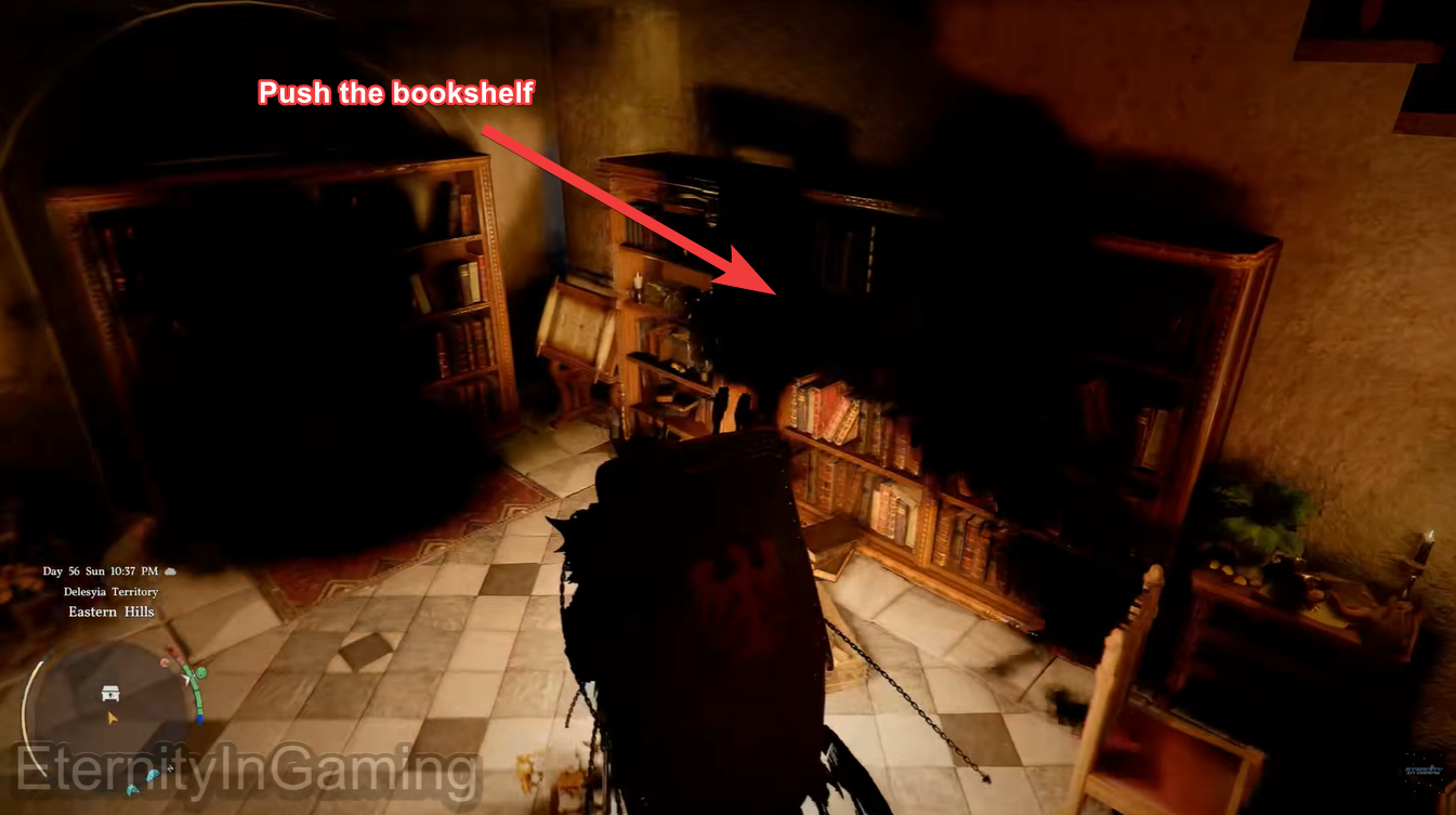 To proceed, interact with the bookshelf and push it aside. This reveals a concealed passage leading into a secret room. The game doesn’t explicitly highlight this interaction, so you must actively test the environment for hidden mechanics.