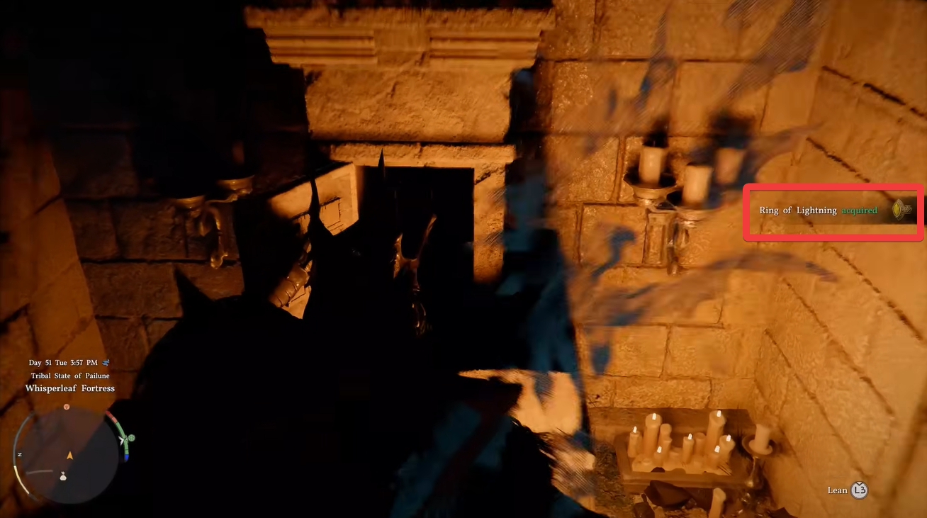 To find the Ring of Lightning, begin by fast traveling to Whisperleaf Fortress near Silverwolf Mountain in the Pailune region. From the main entry point, you should move toward the left side and look for a lower drop area. Once you descend, you will notice a stone structure resembling a hedge or sealed mechanism.
