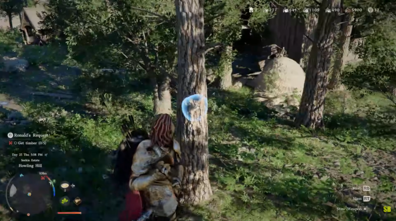 Collect 5 Timber by chopping trees, looting logs, or purchasing from merchants. Using a Logging Axe is the fastest and most reliable method.