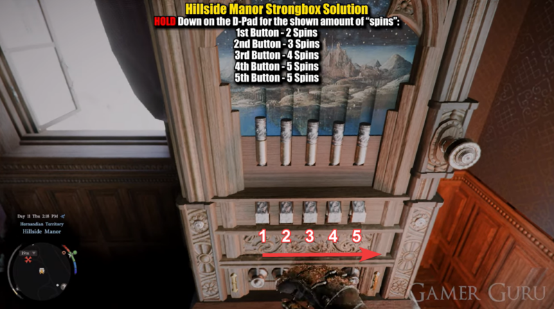 The strongbox puzzle revolves around rotating five buttons using the D-pad, with each button requiring a specific number of spins. Precision matters here—incorrect inputs may reset or fail the puzzle.