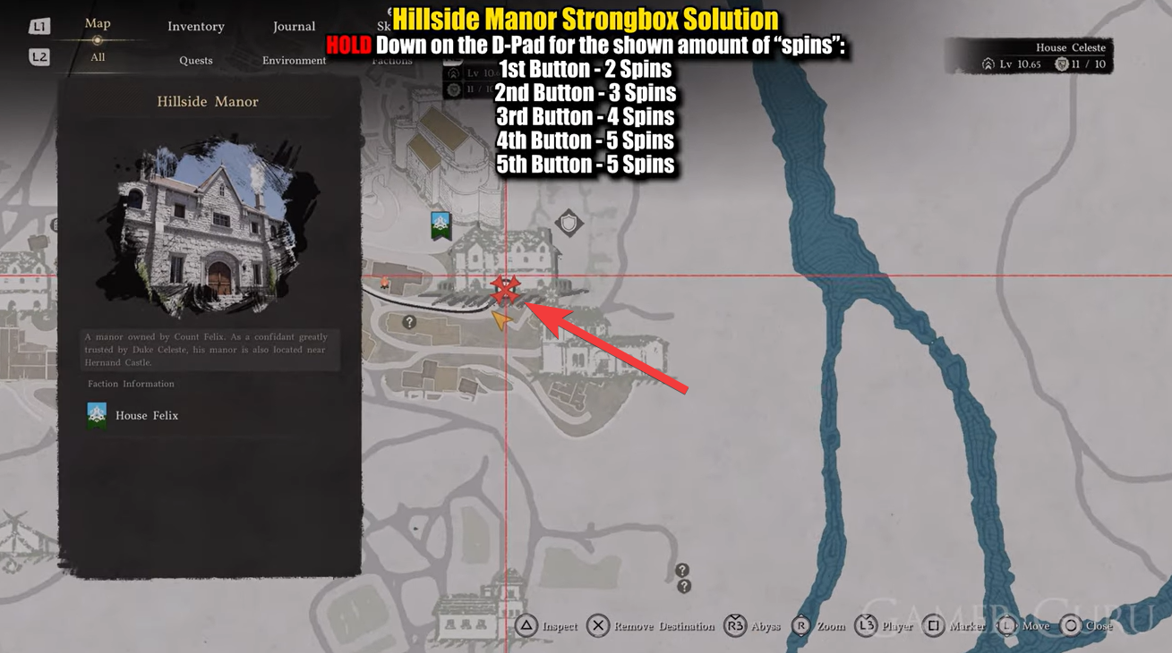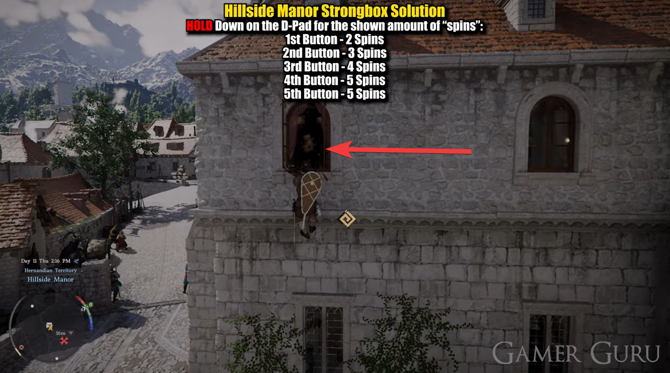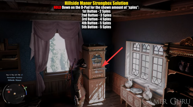The strongbox is located inside Hillside Manor on the first floor, but simply walking in won’t work. You’ll need to approach the manor from outside and climb up the wall to access a window entry point.