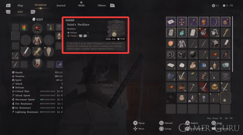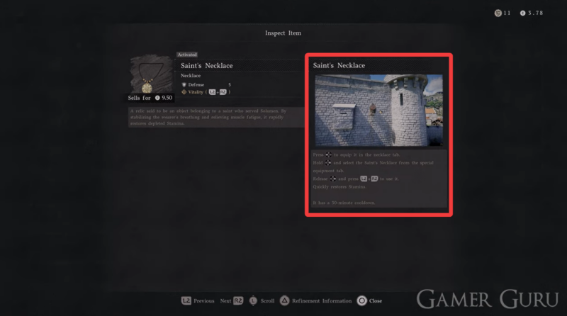 Equip the necklace from the equipment menu under the necklace tab. Access the special equipment tab and select the Saint’s Necklace. Press L2 + R2 to activate its effect during gameplay. Use it strategically when your stamina is fully depleted, especially during critical moments like climbing or combat escapes.