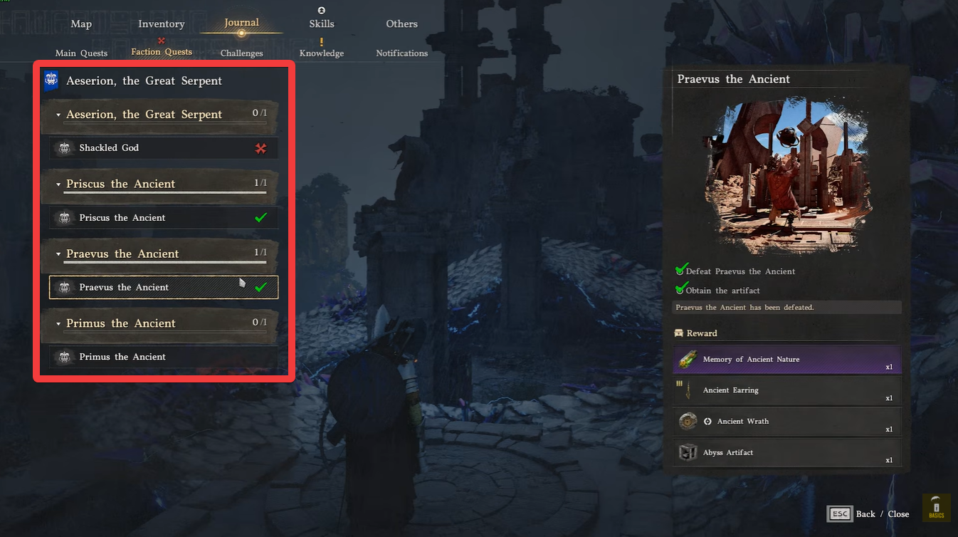 | Praevus the Ancient | Defeat and obtain artifact | Memory of Ancient Nature, Ancient Earring, Ancient Wrath, Abyss Artifact |
