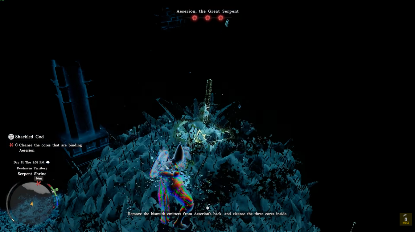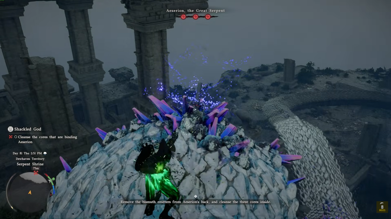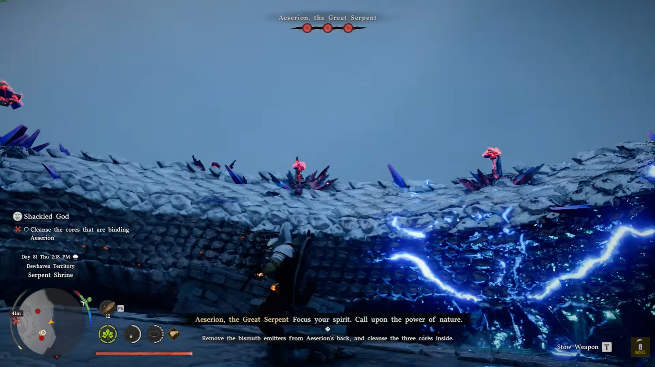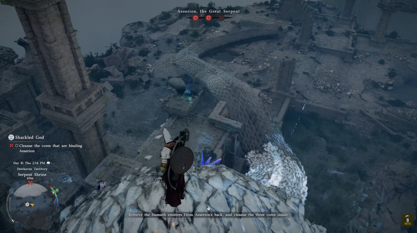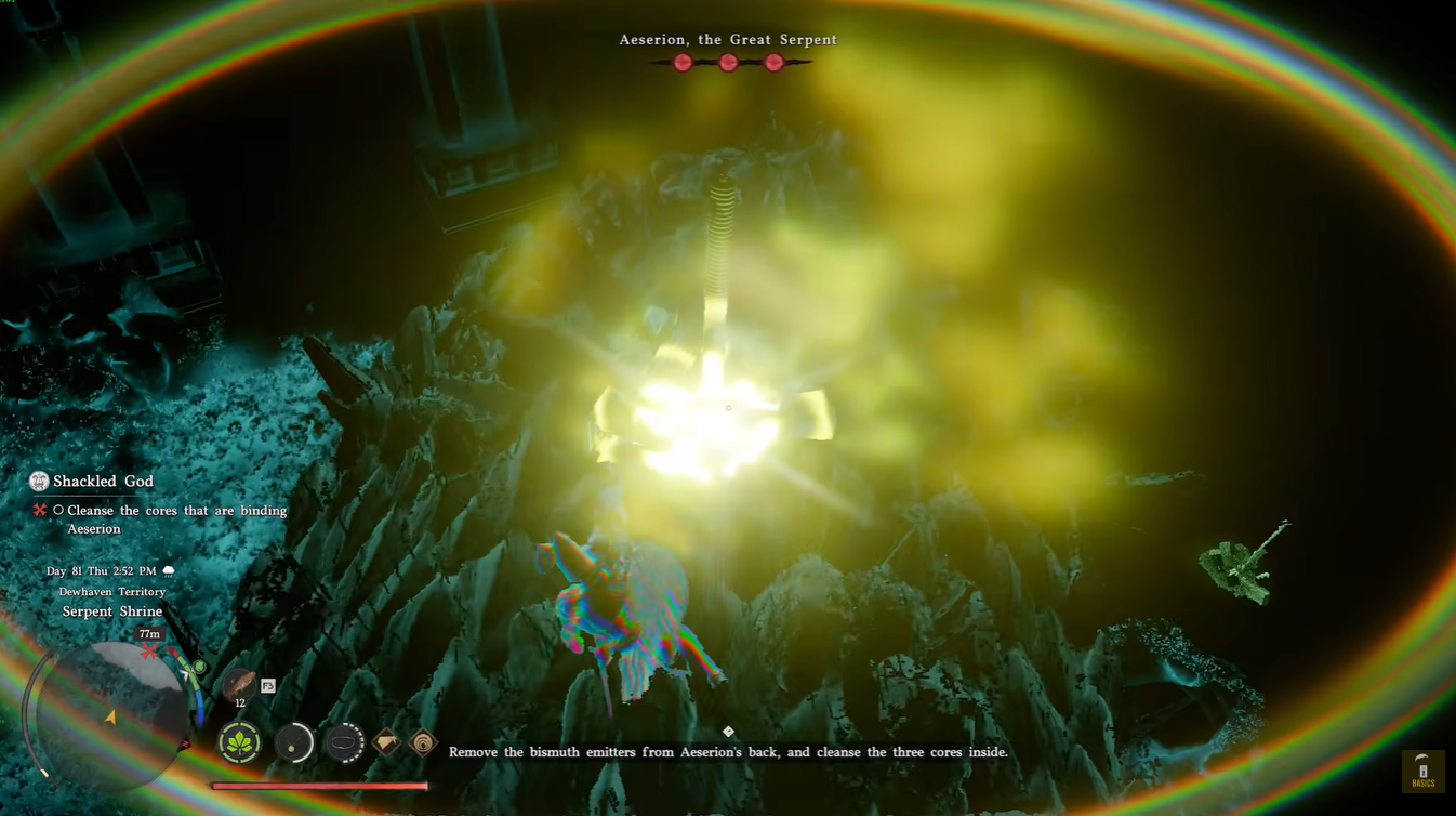 Choose your approach—climb or ranged attacks. You can physically climb onto Aeserion to destroy the growths up close, or stay at range and use charged attacks if positioning allows.