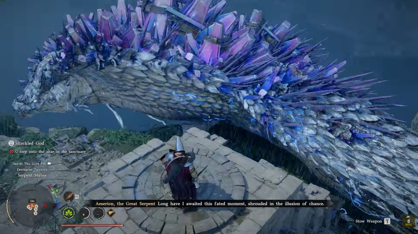 Once all three Ancients are defeated, you’ll return to the main island where Aeserion awaits. This is where the quest shifts dramatically from traditional combat into a large-scale interaction.