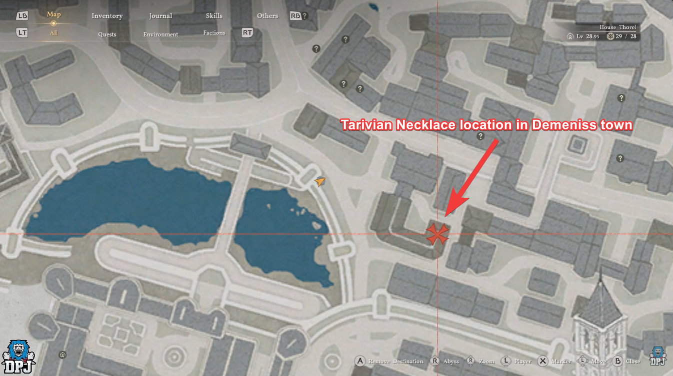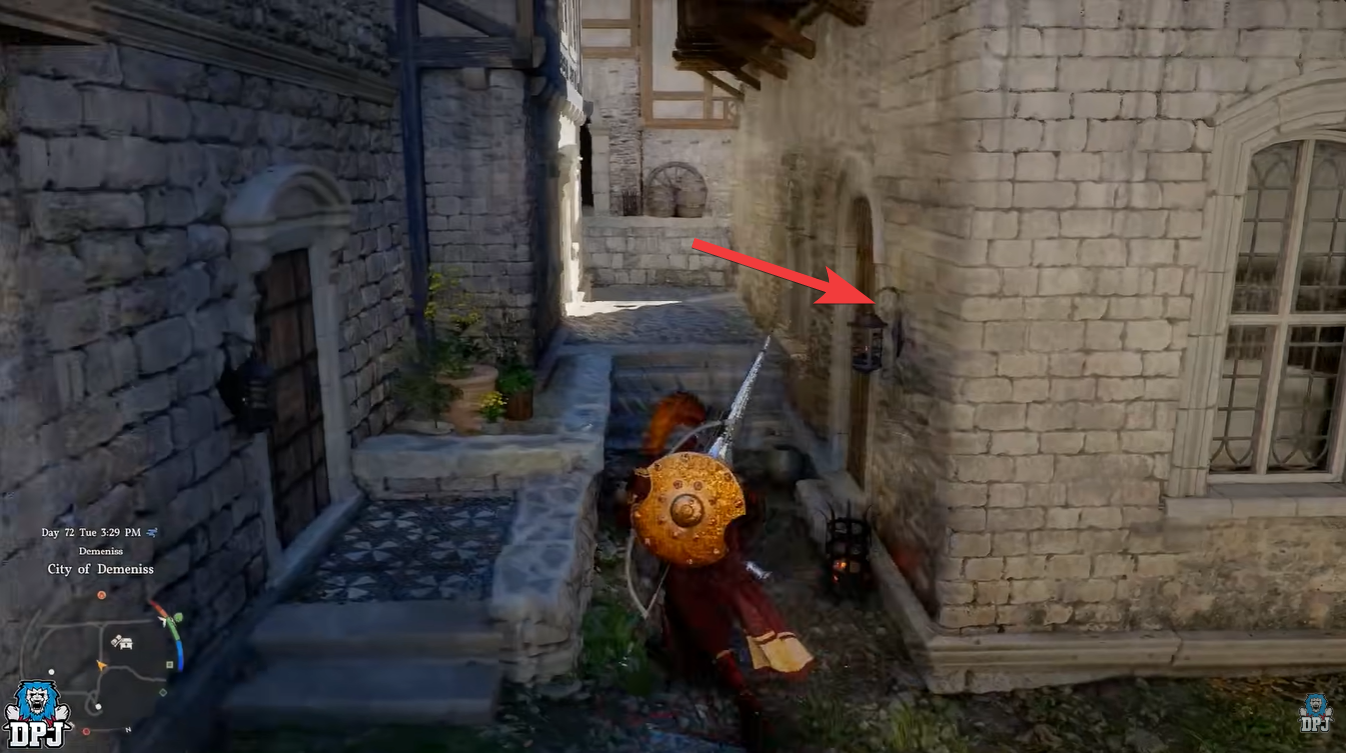 Once equipped, travel to the Town of Demeniss, located near Hernand. The target building isn’t heavily guarded but still requires caution. You should approach from behind rather than the main entrance.