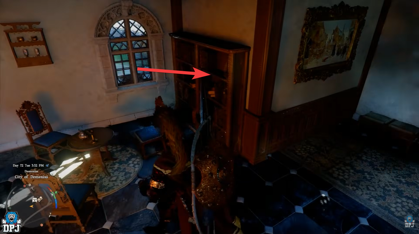 Inside the building, your objective is not immediately visible, which is where many players get stuck. You need to locate a bookshelf that acts as a hidden mechanism.