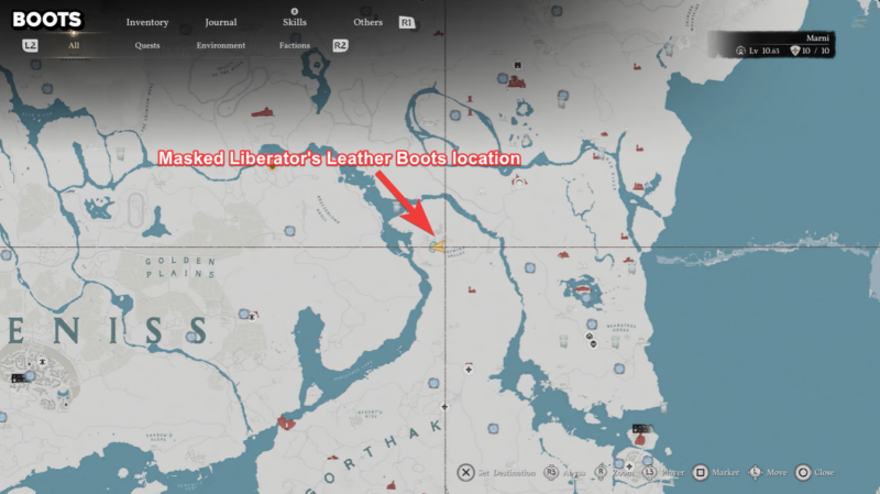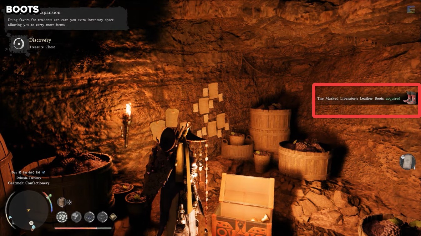 Enter the chamber and locate the treasure chest. Inside, you will find the Masked Liberator Leather Boots.