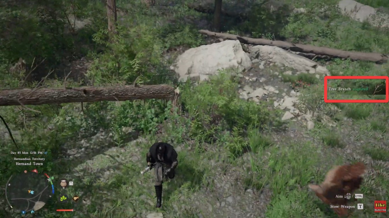 Once the tree is cut, check the dropped loot. There’s a chance you’ll receive a Tree Branch along with other materials like wood.