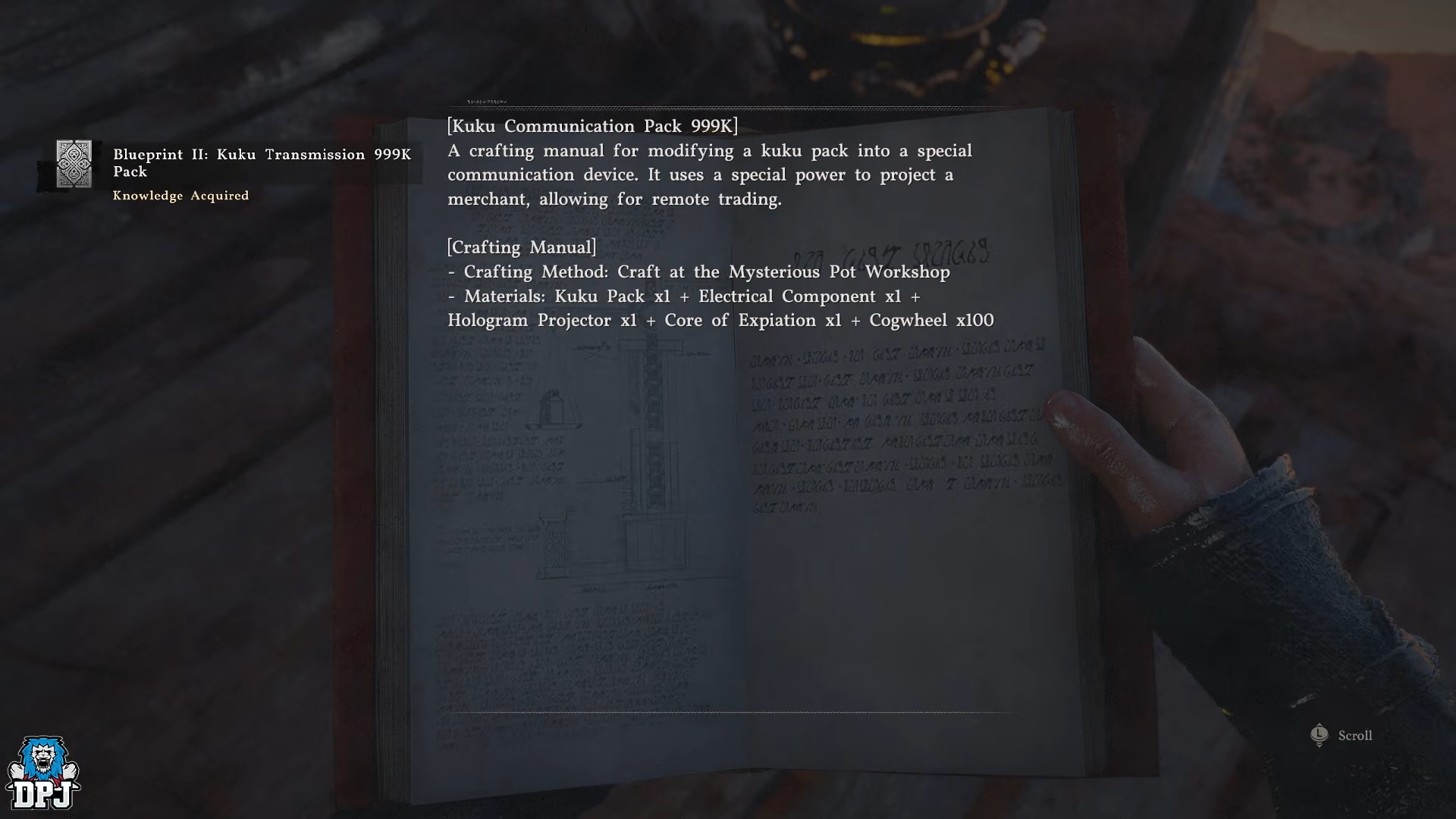- Gather materials like Kuku Pack, Electrical Component, Hologram Projector, Core of Expiation, and 100 Cog Wheels.