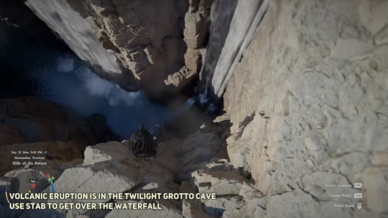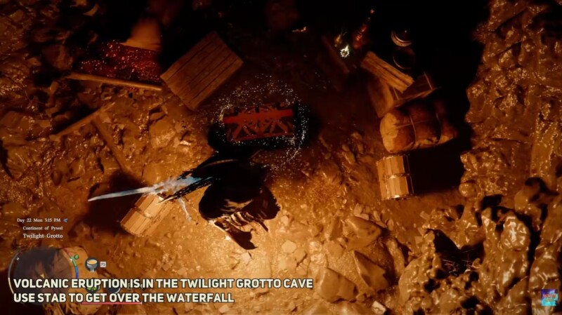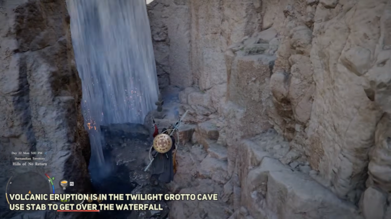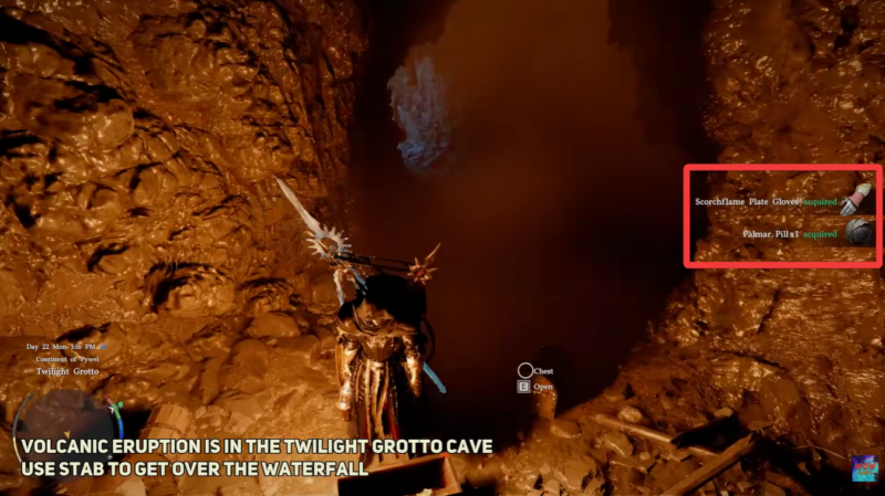 Once you approach the waterfall, you will notice that it is not just decorative. You can interact with it by using your character’s stab ability, which allows you to push through into a hidden cave known as the Twilight Grotto. This small but rewarding dungeon contains a chest that holds the Scorchflame Plate Gloves.