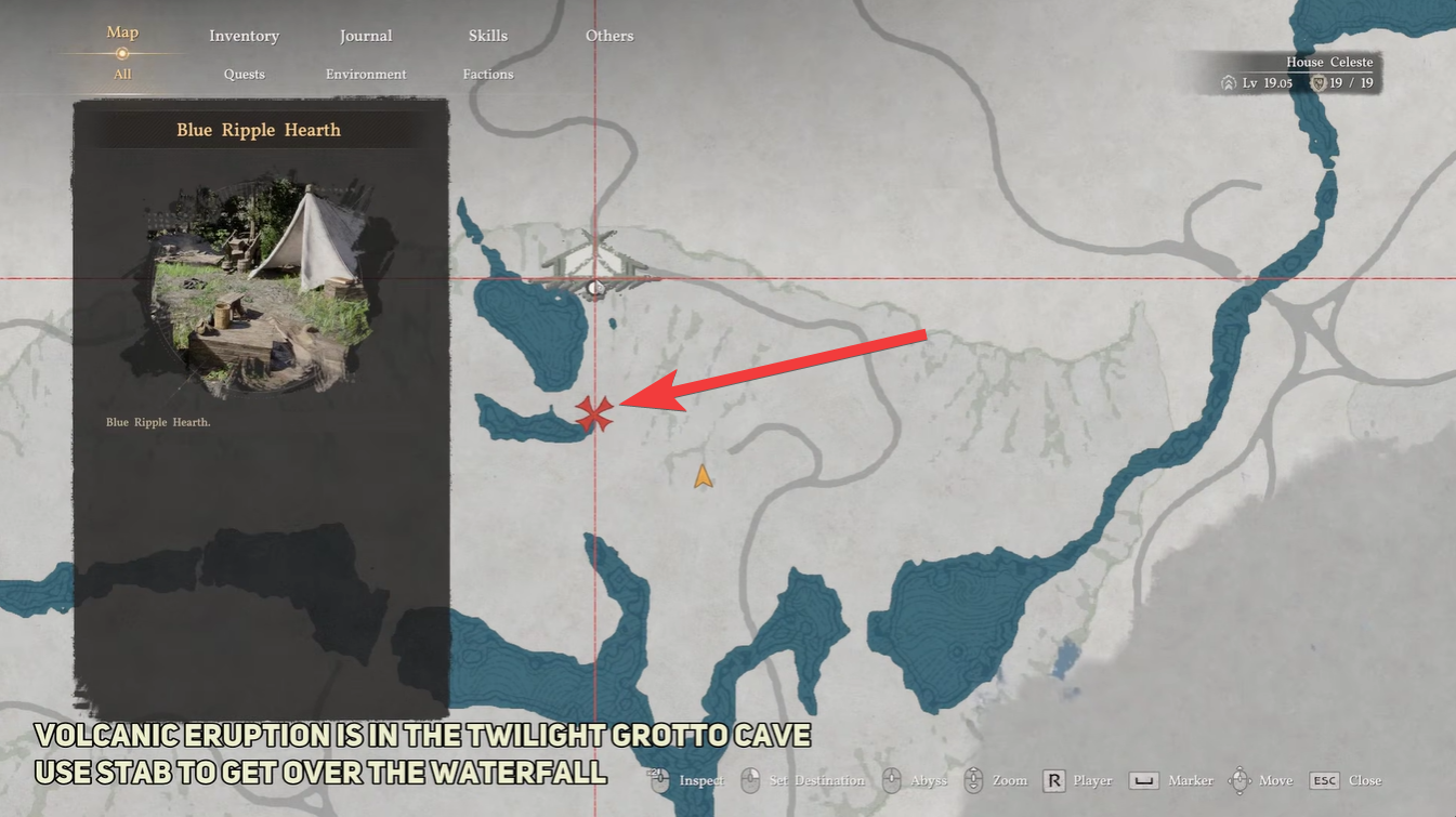 Travel to Hernand’s Hills of No Return and locate Blue Ripple Hearth. This acts as your primary landmark and makes navigation easier.