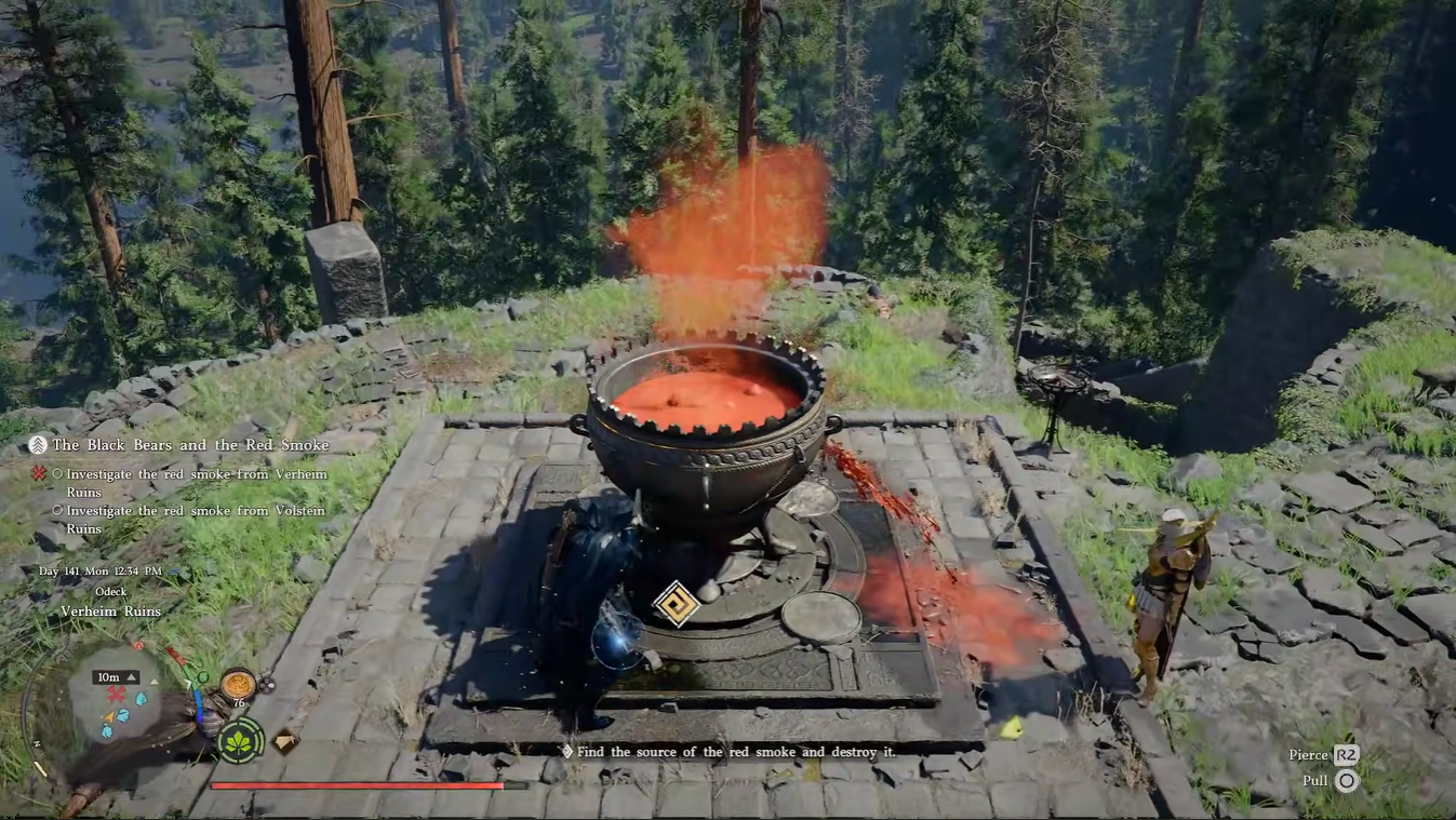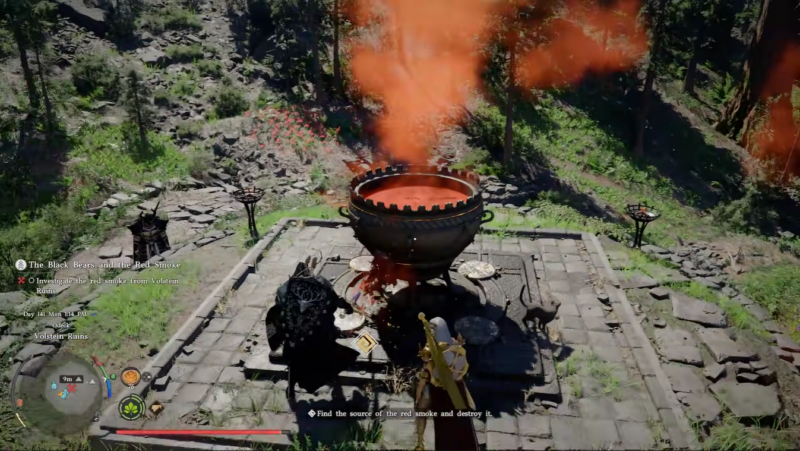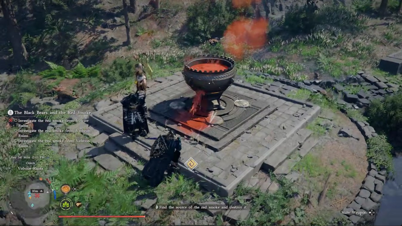 From there, you embark on finding the root cause of the red smoke in the area. Noticing the three ruins in the Odeck, namely Volvior, Verheim, and Volstein, are the places where red liquid is being brewed to steam off smoke and kill the villagers. Therefore, you investigate the vessels at these locations to complete the quest: