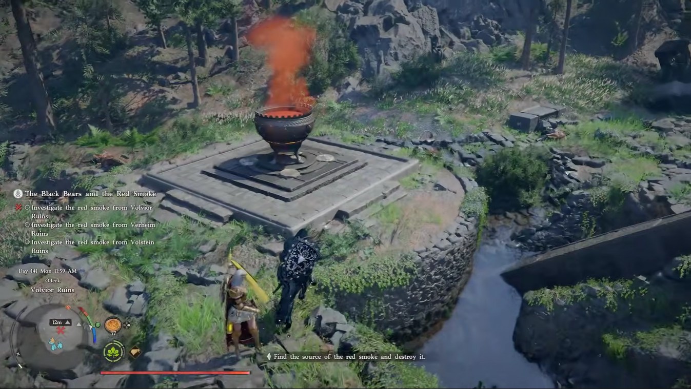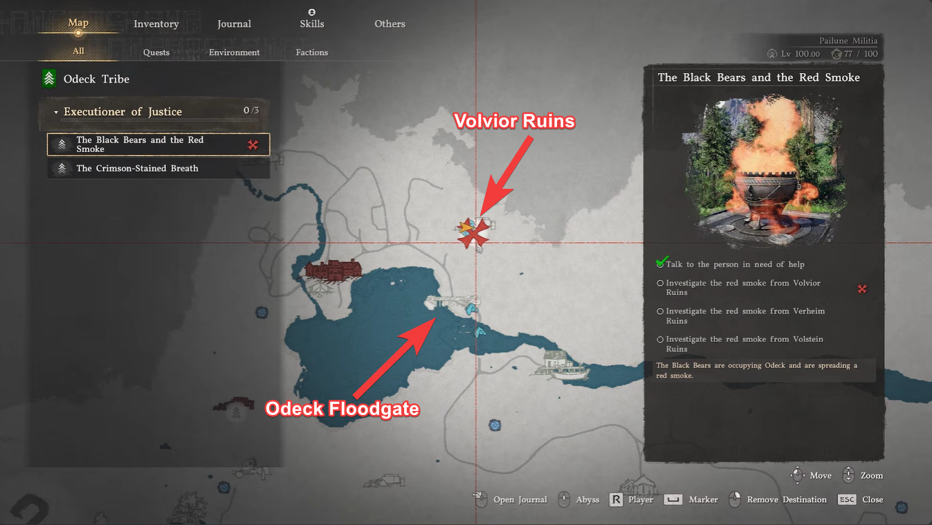 You’ll start this quest in the Odeck Floodgate area of Pailune. As you explore the region, look for a distressed individual asking for help regarding strange red smoke. This NPC explains that Black Bear bandits are responsible for the pollution spreading across nearby ruins.