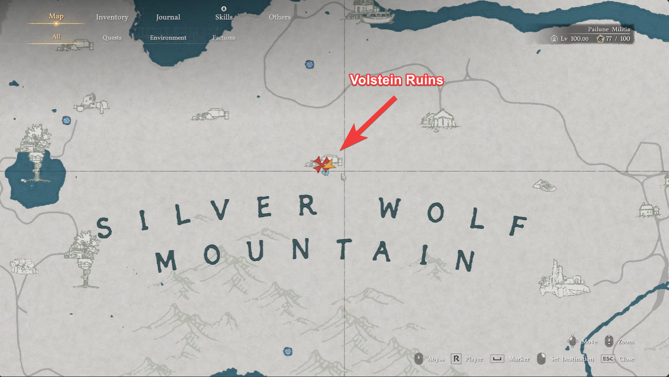 Locate Volstein Ruins just above the “R” in Silverwolf Mountains on your map.
