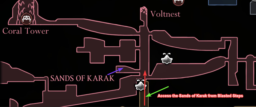 Access the Sands of Karak from Blasted Steps. Fast travel to the westernmost bench in Blasted Steps for a quick route, then climb upward using grapple chains and the Clawline ability. Enter the Sands of Karak and continue climbing upward.