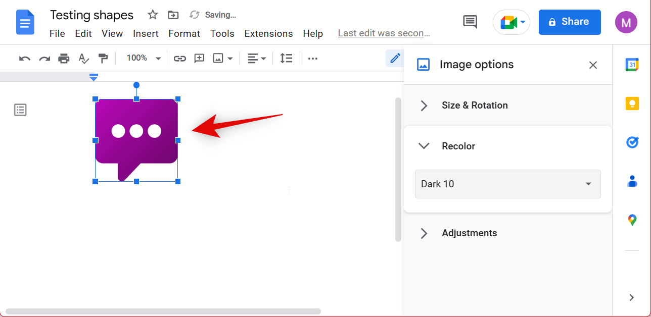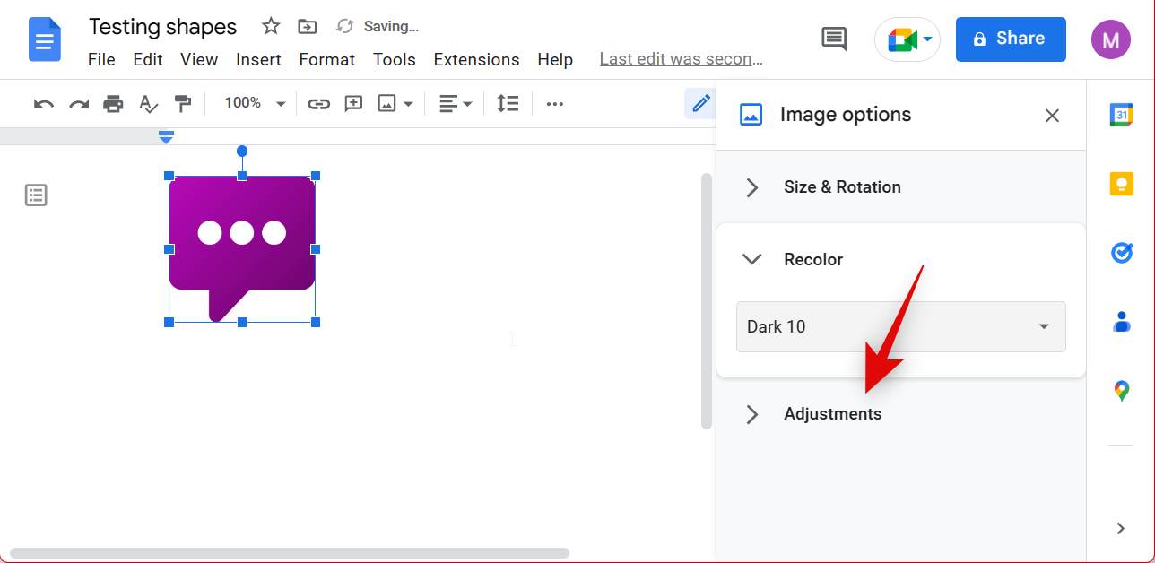 Note: If you’ve added shapes that aren’t colored or are just line drawings, then, unfortunately, you won’t be able to recolor them in Docs. - Now click Adjustments.