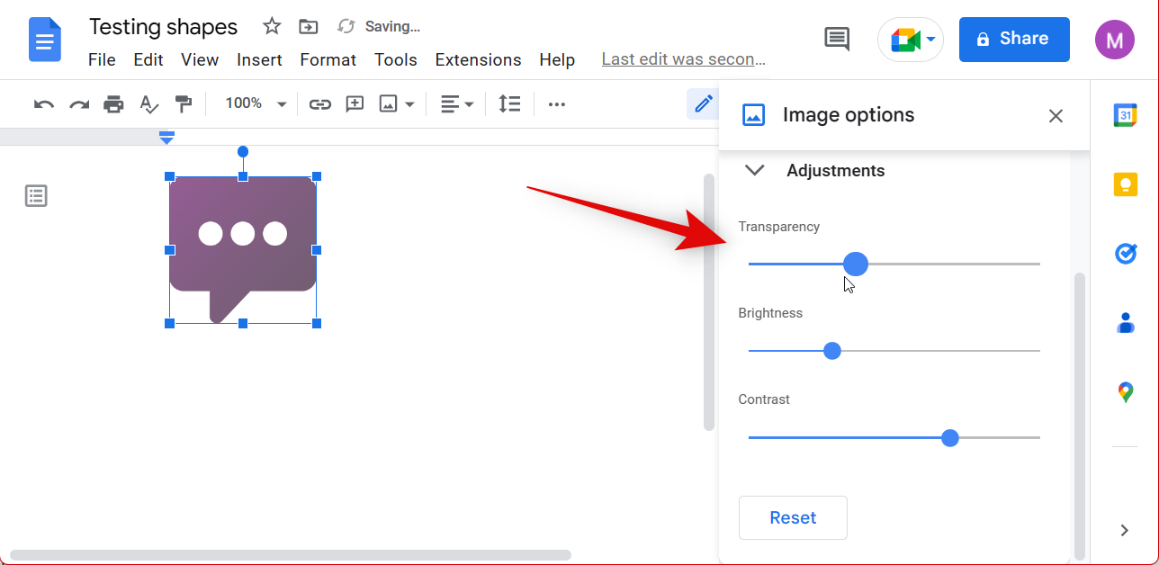 - Use the slider for Transparency to adjust the opacity of your shape.