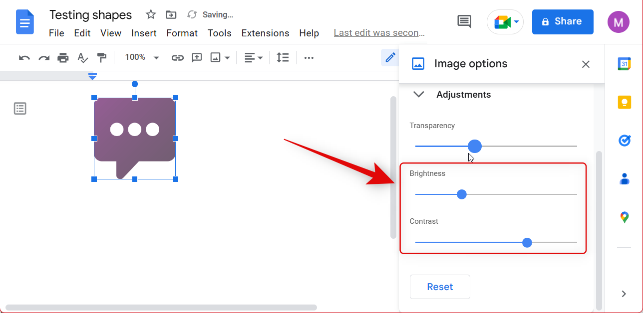 - Similarly, use the sliders for Brightness and Contrast to adjust brightness and contrast for your shape as needed.