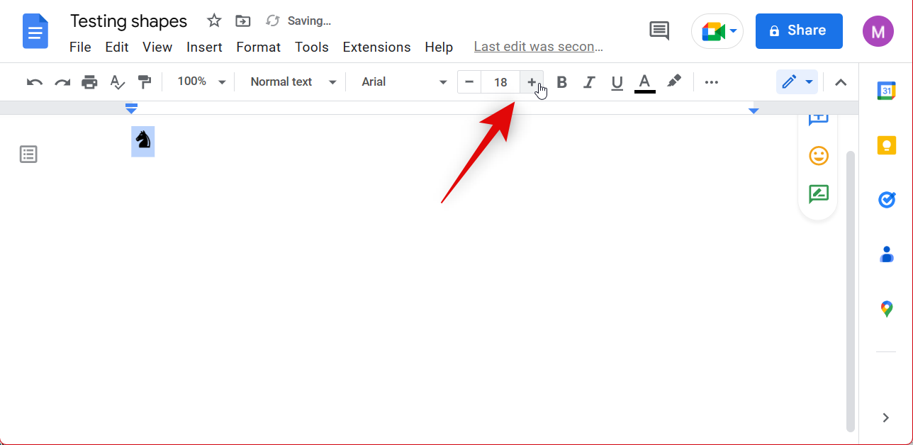 - Select the character in your document using the mouse or keyboard. Ensure that you don’t select any text, or else the size change will be applied to your text as well.