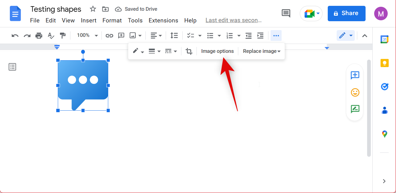 Image options allow for more control by resizing your drawing using numerical values. This allows for better control over your shape size, especially if you wish to get it printed to exact sizes on paper. Use the steps below to use image options to resize your drawing in Google Docs.