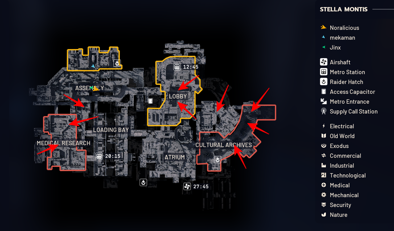 Hit these spots for reliable spawns: Cultural Archives, Storage Room, Business Center, Atrium, Cafeteria, Security Bridge, Medical Research, Sandbox, Robotic Sandbox B, Seed Vault Aishaft, and Lobby Metro. Chain encounters in tight corridors, using doorways to kite safely.