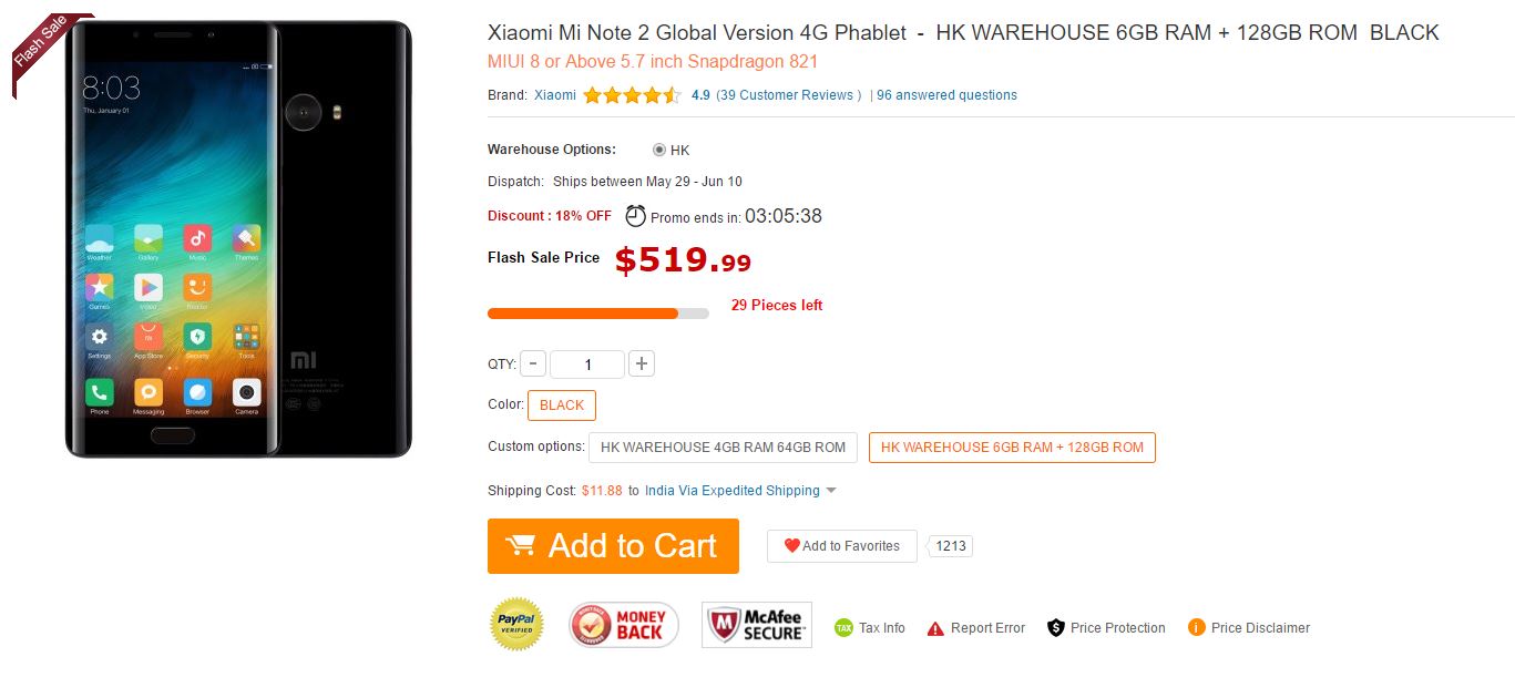 In addition to that, Banggood.com is also offering the 128GB Global Black variant of the Mi Note 2 for $498.29 and to compete with Gearbest, Banggood too offers $49.83 off with coupon code note2128 bringing the price down to $448.46. Shipping is free for both re-sellers making it a pretty sweet deal considering that the original price of the Mi Note 2 is $899.