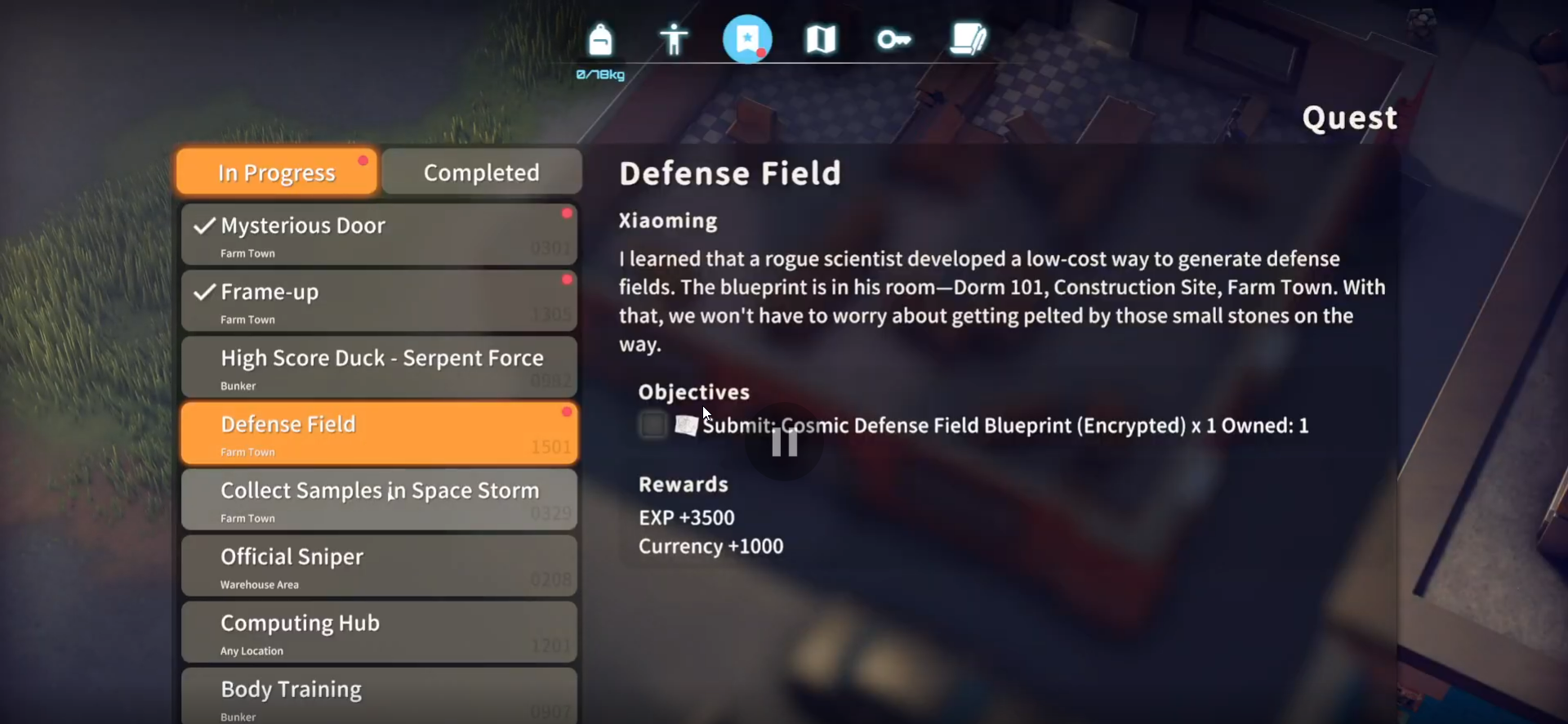 The quest Defense Field is given by Xiaoming in Farm Town. You’ll need to locate and submit a special encrypted blueprint. Completing it rewards you with EXP and currency.