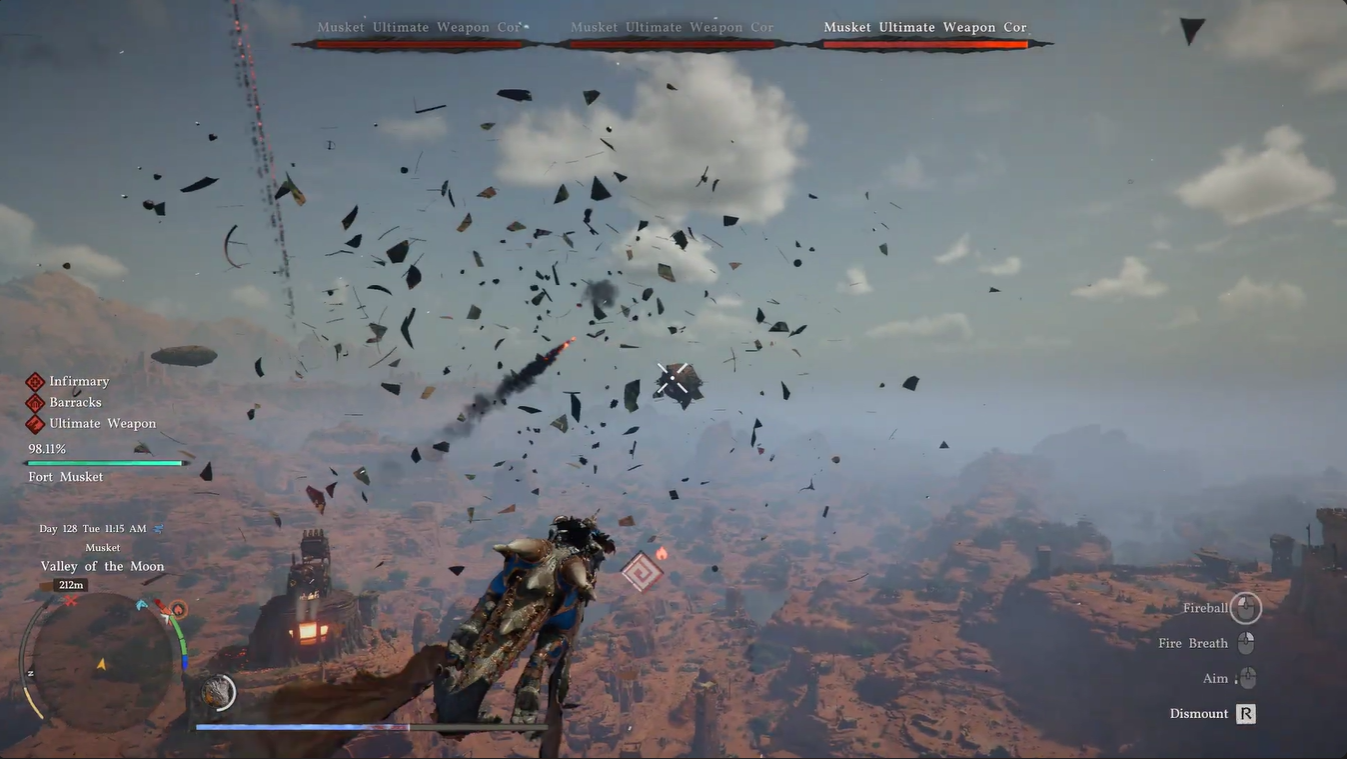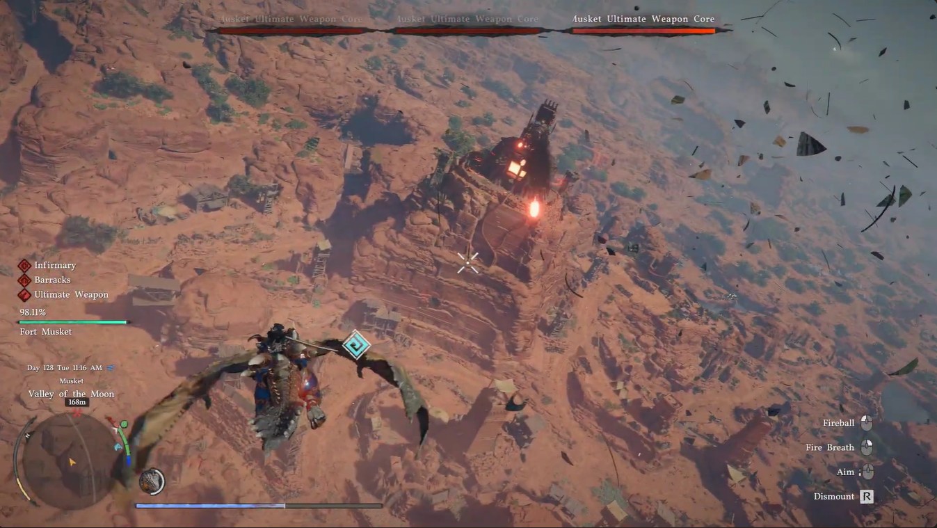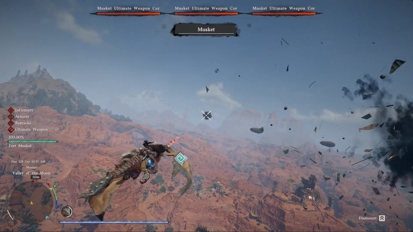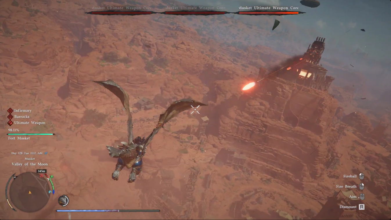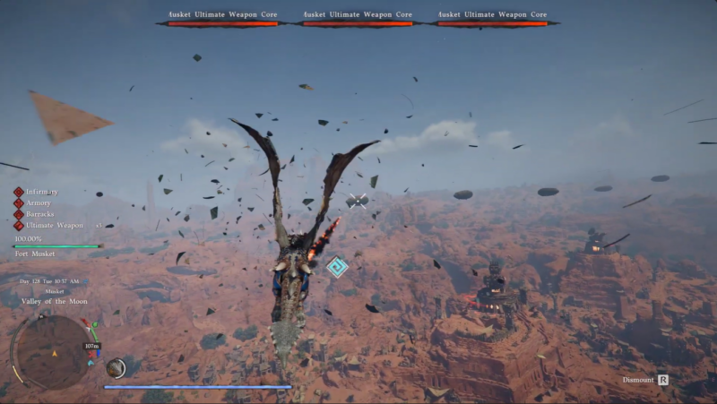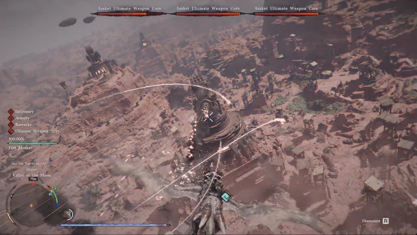 The fight unfolds in the skies between Demeniss and Tashkalp, placing you in a wide-open aerial battlefield filled with enemy airships and massive weapon cores. You’ll immediately notice that mobility is your biggest asset—and your biggest challenge. Unlike ground combat, there’s no cover unless you deliberately retreat behind terrain like mountains.
