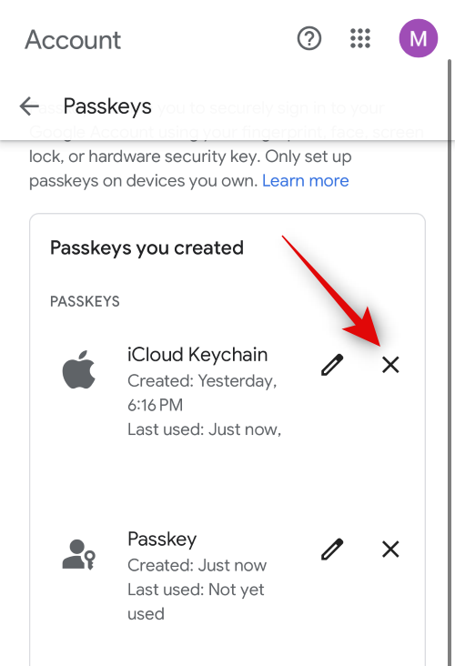 - Once signed in, you will be presented with the Passkeys page. Tap on the X icon beside the passkey you wish to remove.