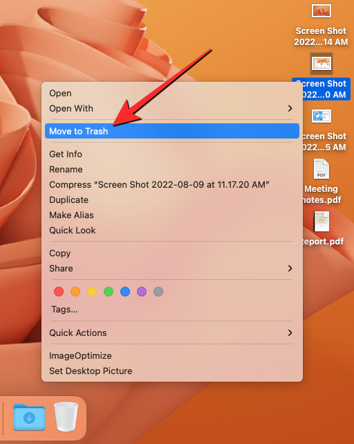 - To delete the selected screenshots and move them to Trash, right-click or Control-click on any selected file and then select Move to Trash from the menu that appears.