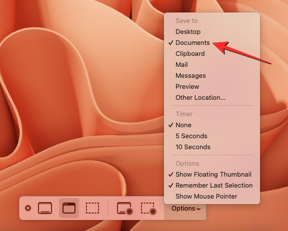 - The folder/location that has a tick-mark on its left-hand side is where screenshots are saved on your Mac. In the screenshot below, we can see that there’s a tick mark next to Documents inside “Save to”.