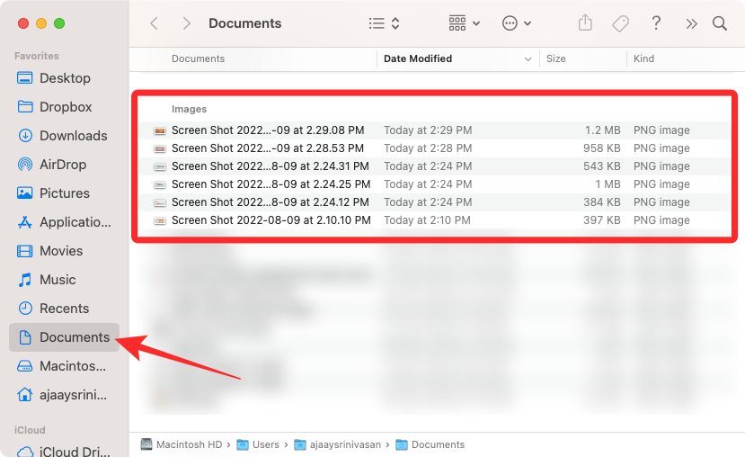 - Inside Finder, go to the folder where your screenshots are located. In this instance, it is the Documents folder. You’ll now see all your screenshots in this folder.