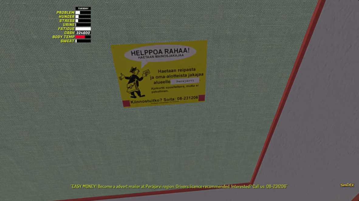 You can get the advertisement delivery job in My Winter Car by finding the correct job listing at the PSK gas station and applying for it through an in-game phone call.