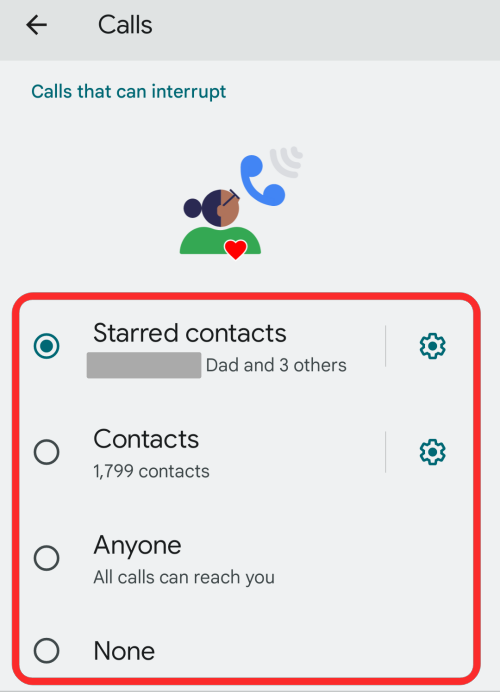 Starred contacts – Selecting this option will allow calls from contacts listed as favorites on the Phone app. You can further configure this option by tapping on the cogwheel icon and adding more starred contacts.