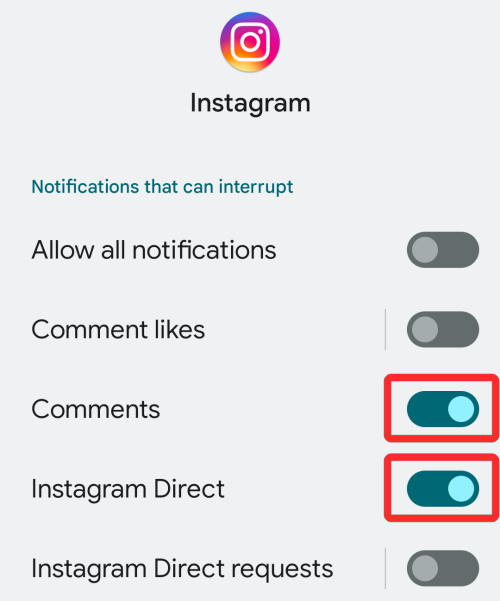 - All the notification types that are available for the selected app will now appear on the next screen. In Instagram’s case, you can either allow all of the app’s notifications or customize them to have certain alerts like Comments, Direct messages, Likes, and Mentions to show up during DND. Let’s say you want only Direct messages and Comments to go through. For that, you will enable the toggles adjacent to Comments and Instagram Direct.