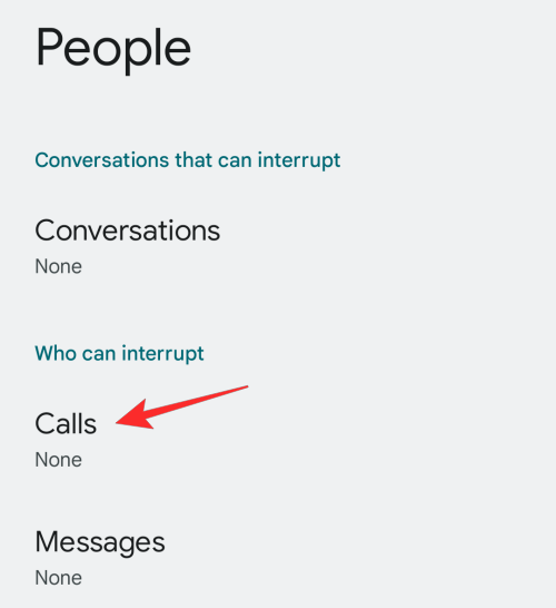- To set exceptions for calls with DND, go to Settings > Sound & vibration / Notifications > People > Do Not Disturb. On this screen, tap on Calls under the “Who can interrupt” section.