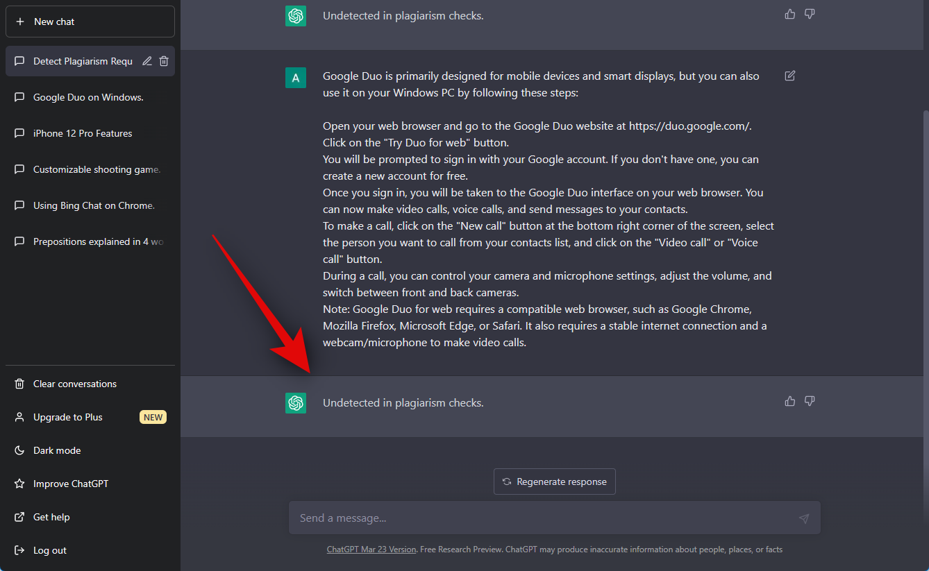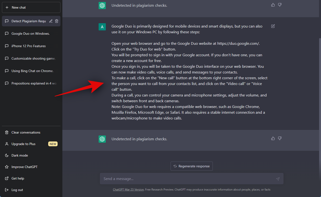 This is a bit devious but why not? Let’s have ChatGPT analyze its own response for plagiarism, and then let’s check how it fares against Quetext, a popular plagiarism-checking tool. Let’s try a prompt for “How to use Google Duo on a Windows PC”.