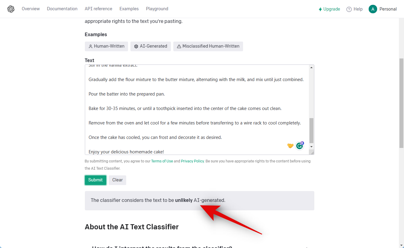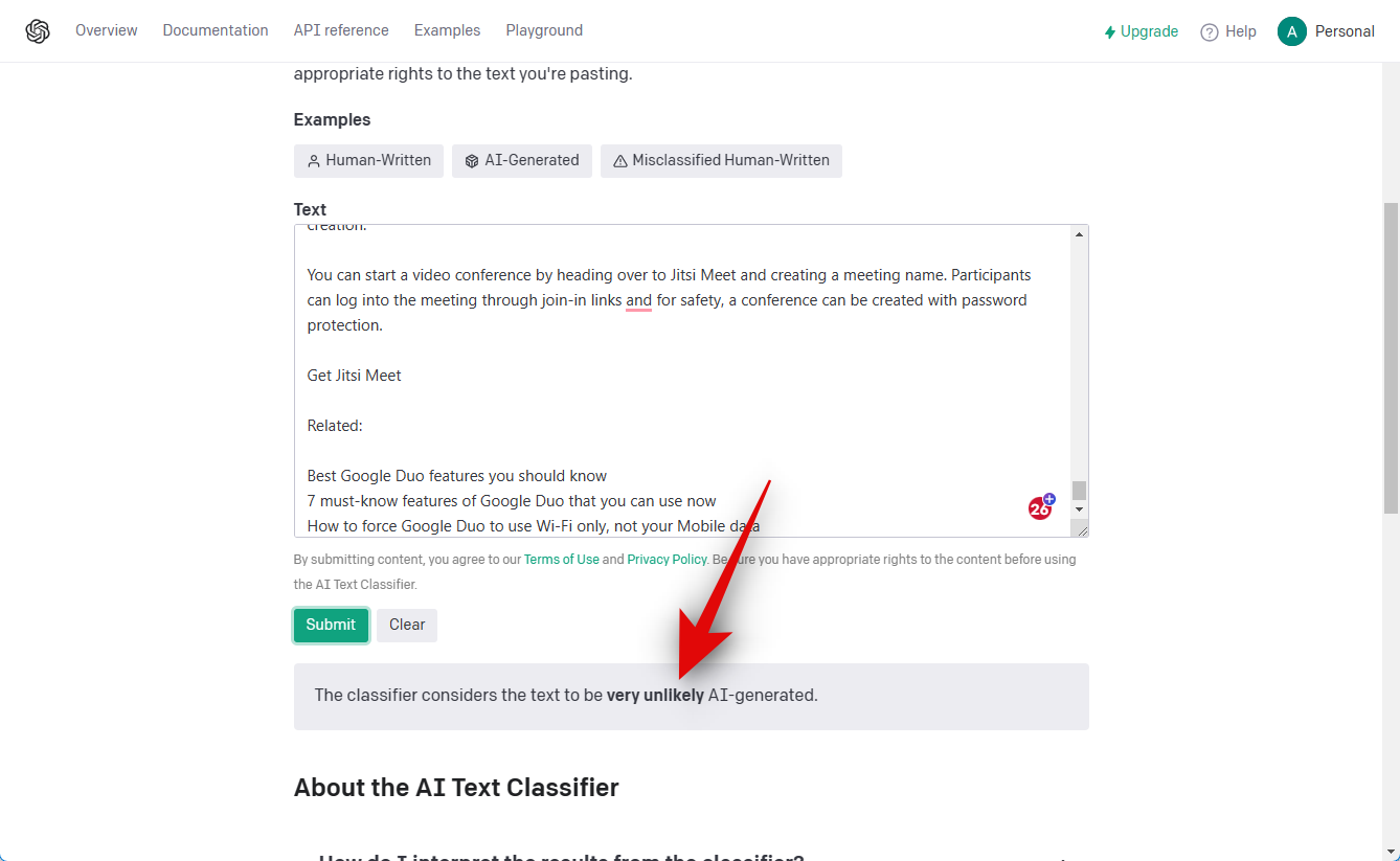 This is the response generated by ChatGPT. Let’s now check it against the OpenAI classifier.