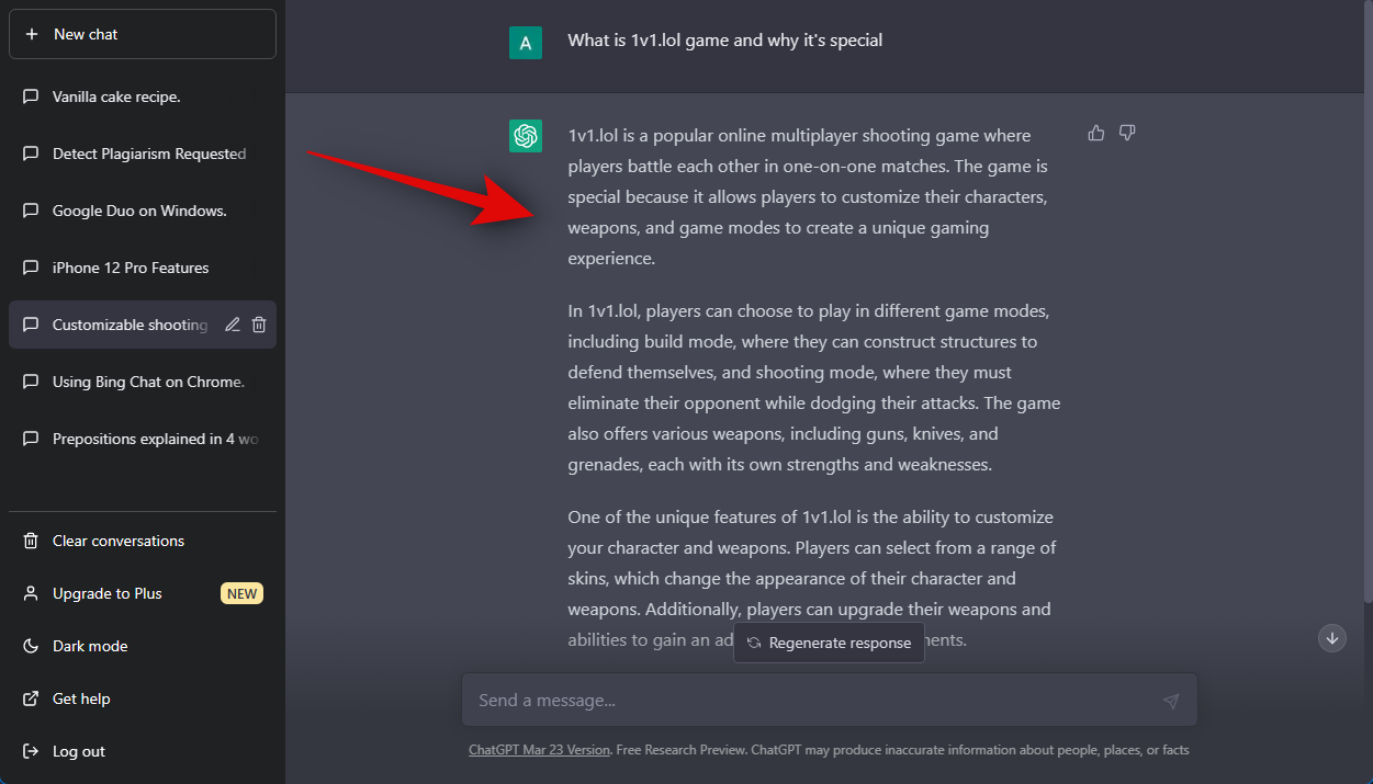 Now let’s try a published news story from 2020. This will help us ensure that we can test it against ChatGPT’s knowledge base, as it has only been trained up to content publically available until 2021. Let’s have ChatGPT generate a response for the “What is 1v1.lol game and why it’s special” post that was published by us back in 2020.