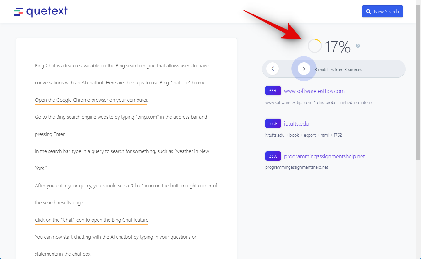 Around 18% of the content is detected for plagiarism. This time the websites seem to be relevant as well as the phrases used by ChatGPT seem to be an exact match for the published content. Let’s see how the content fares when checked using Quetext.