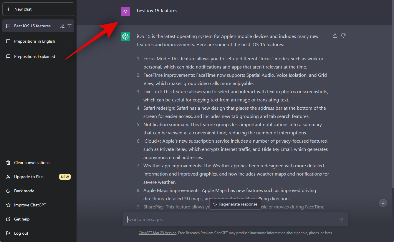 Next, let’s test for a popular, published story. This will give us the ability to check ChatGPT’s response against most website content, as the story will be quite popular and should be currently covered by a lot of websites. Let’s check out “Best iOS 15 features” in this example.