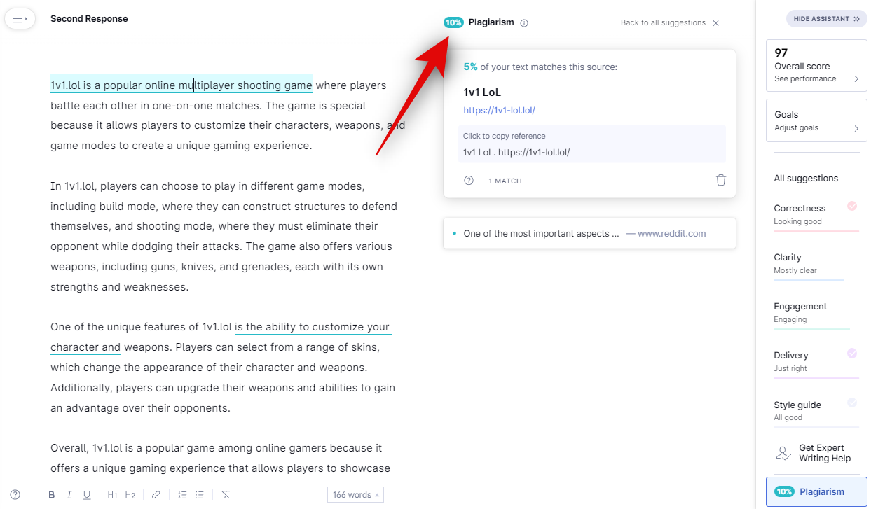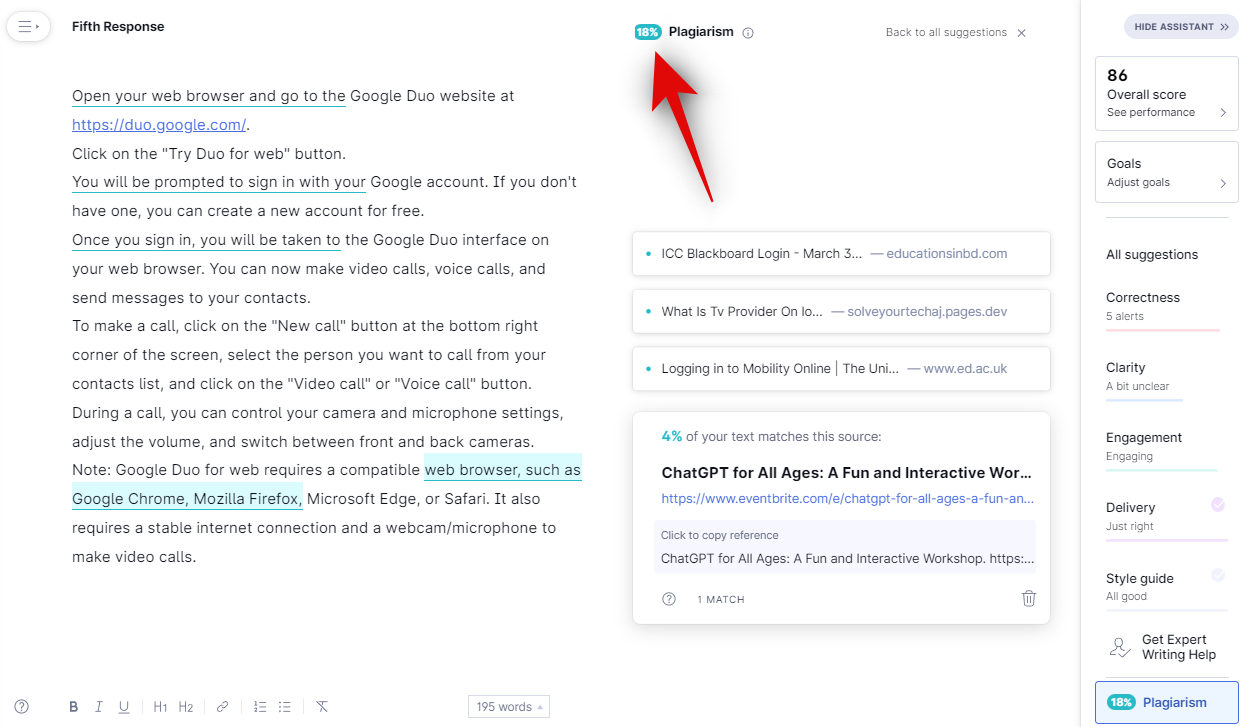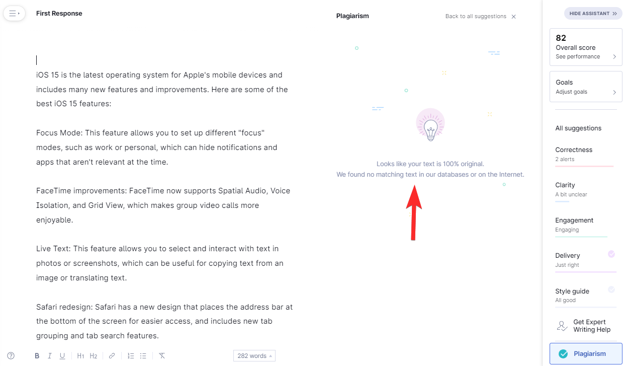 Finally, let’s check the response using Grammarly’s plagiarism checker.