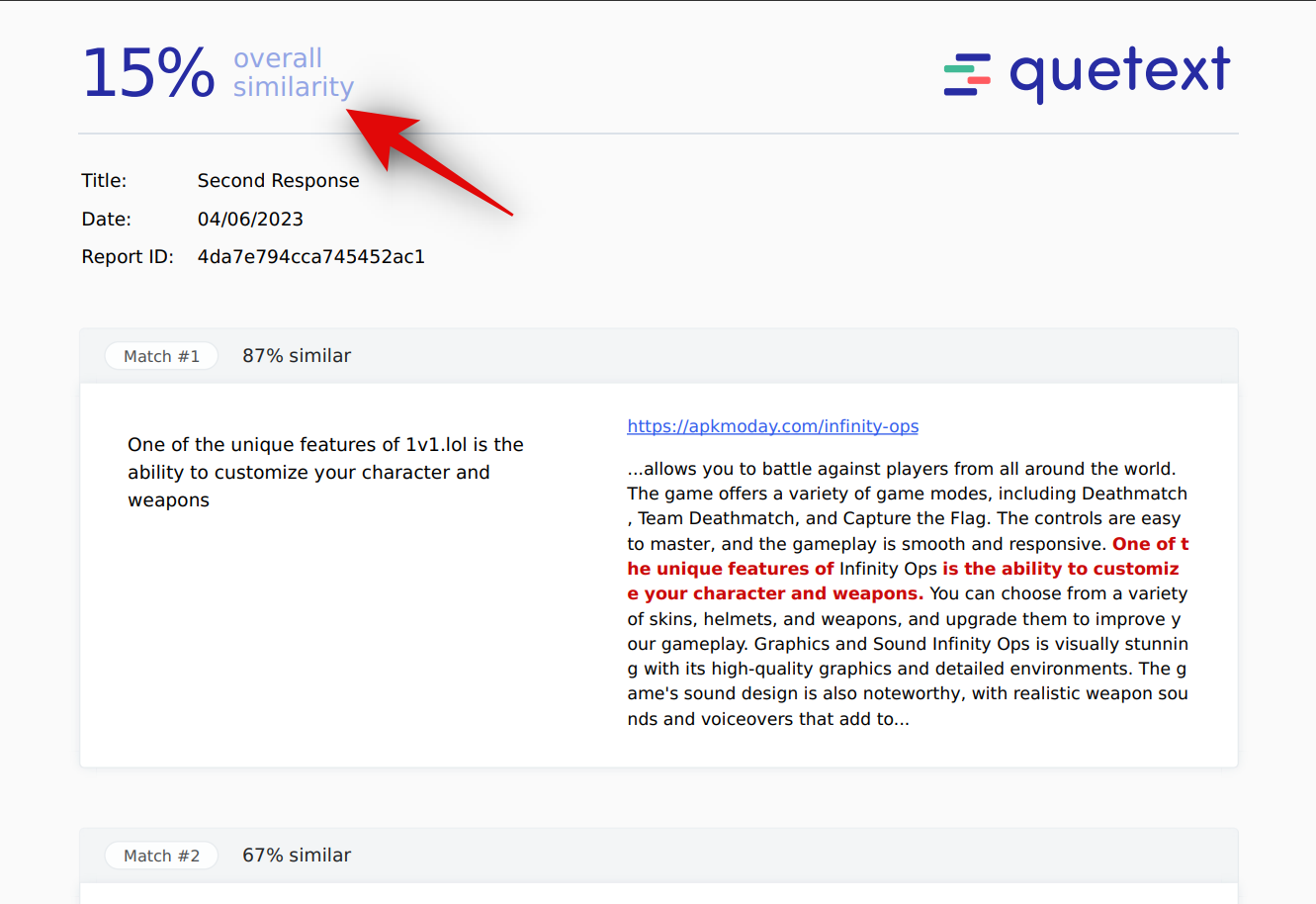 Unfortunately, according to Quetext, around 15% of the content generated by ChatGPT is plagiarized. This can be an issue depending on your client; however, if you notice, the matching phrases seem to be quite generic. And the website where the matching content was found isn’t addressing 1v1 specifically.