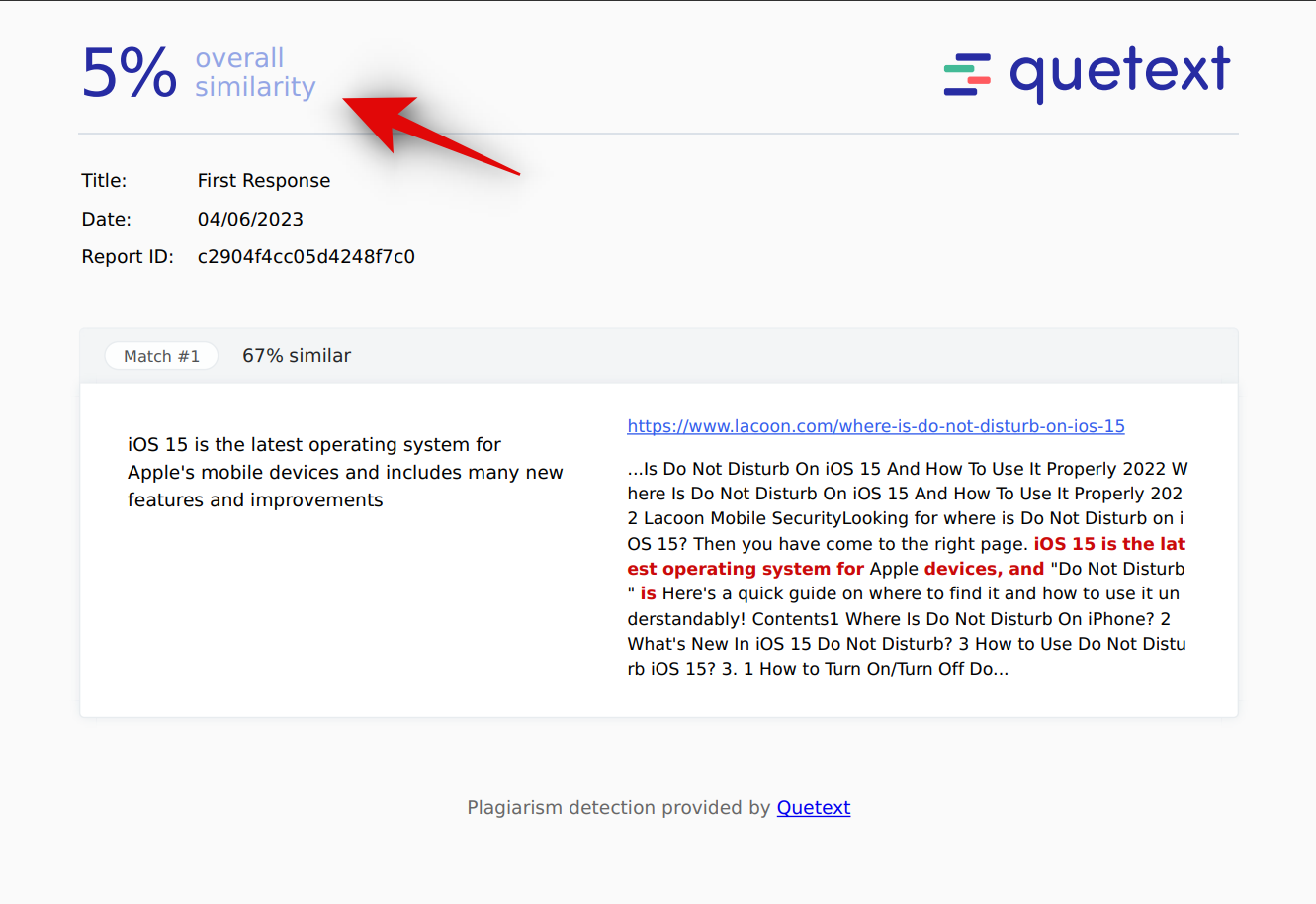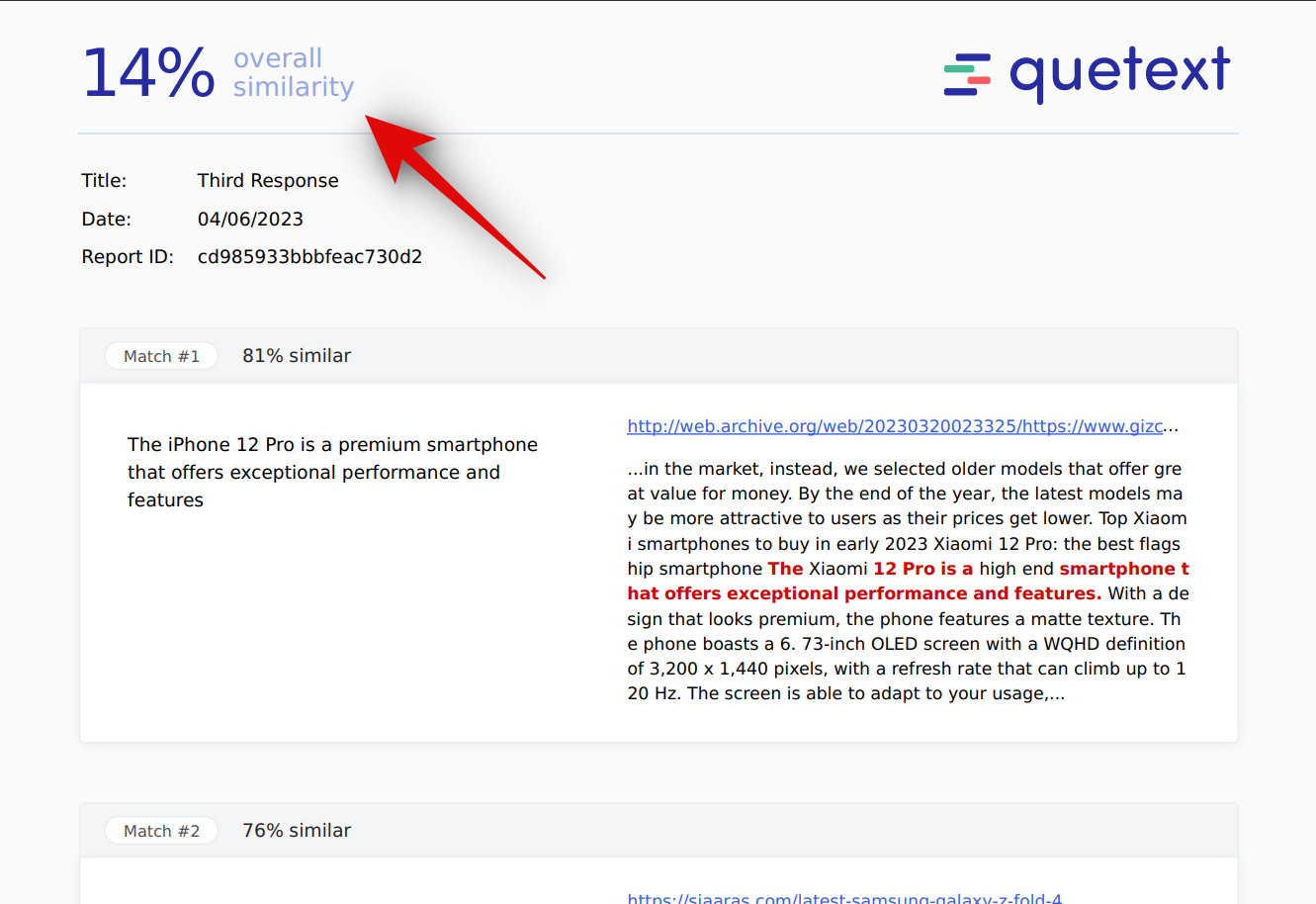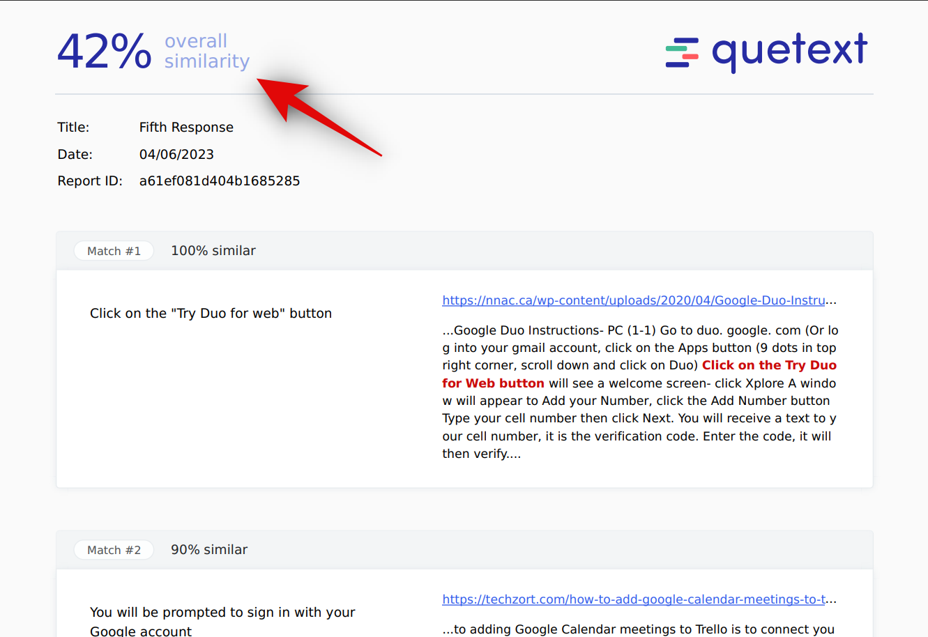 Quetext also finds the content to be plagiarized. With a score of 42%, the content might be rejected by your client unless you decide to edit it or remove the matching phrases.