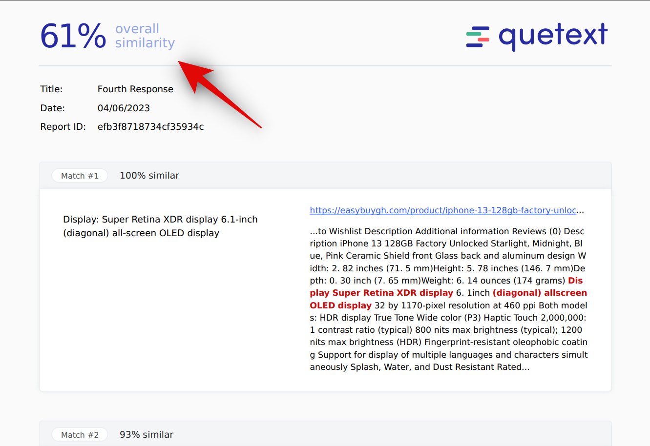 When it comes to technical specifications, around 14% of the content seems to be plagiarized. This is to be expected as features and technical specifications will end up being the same across posts for the same product. Let’s see how the content fares when checked with Quetext.